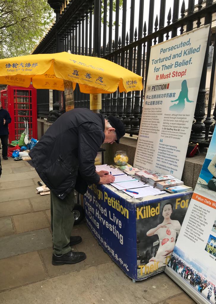 学员先回答了拿工资的问题:“我家人在一九九八年就来英国读书,后来就一直在英国工作,在二零零三年全家都有了永久居留的身份。这些年,家庭条件经济上都还不错,我现在有份兼职工作,一周做两、三天。这不,在不工作的日子,一定会安排时间到大英博物馆来(告诉人们法轮功的真相)。我来在这里,就是一份责任,凭着自己的良心。”