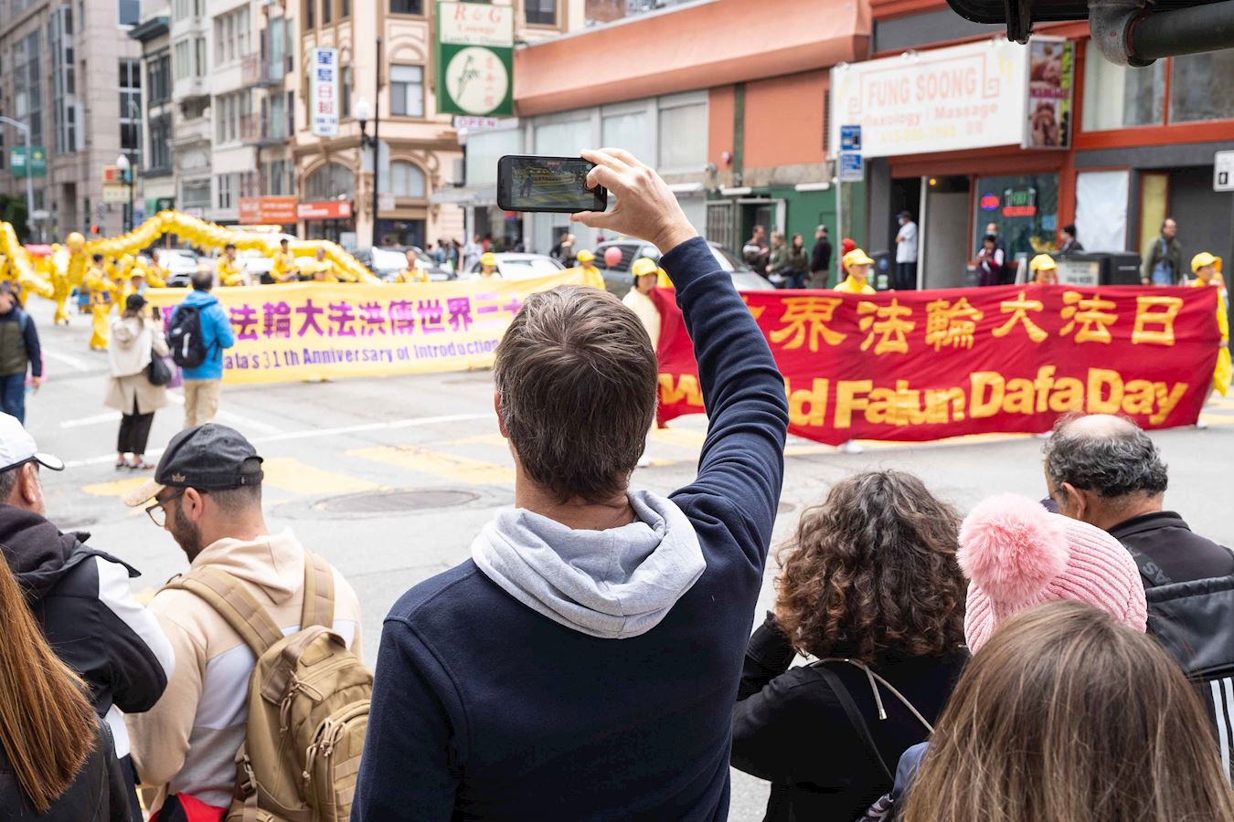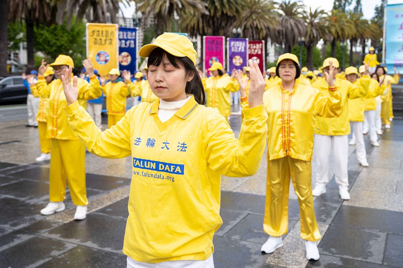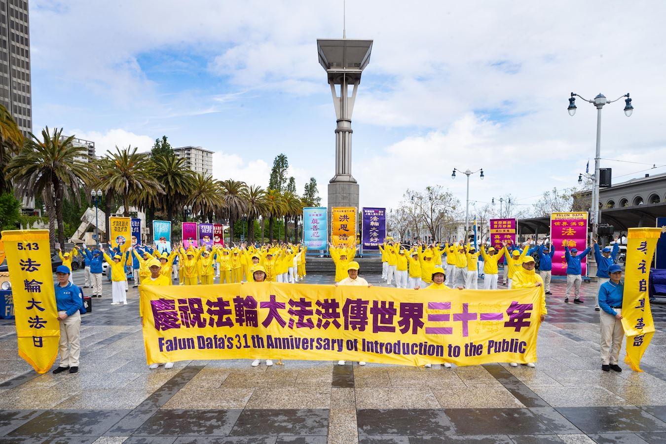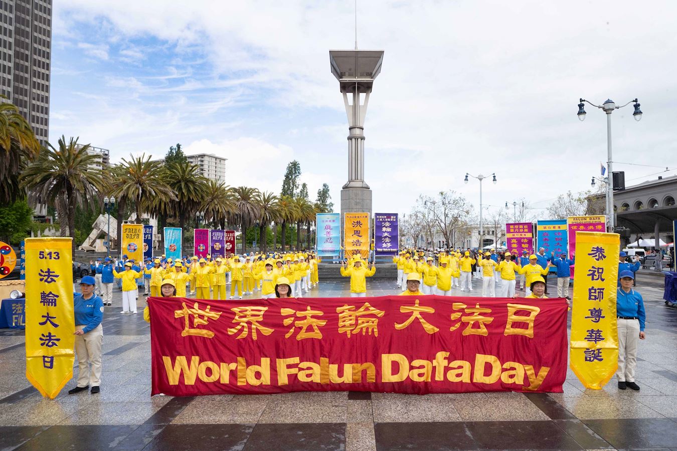 星期六上午九点,法轮功学员首先在旧金山渡轮大厦(Ferry Building)广场前集体炼功,展示祥和优美的功法,庆祝法轮大法日。许多游客被吸引,了解什么是法轮功。还有不修炼的人特地来参加法轮功学员的游行。