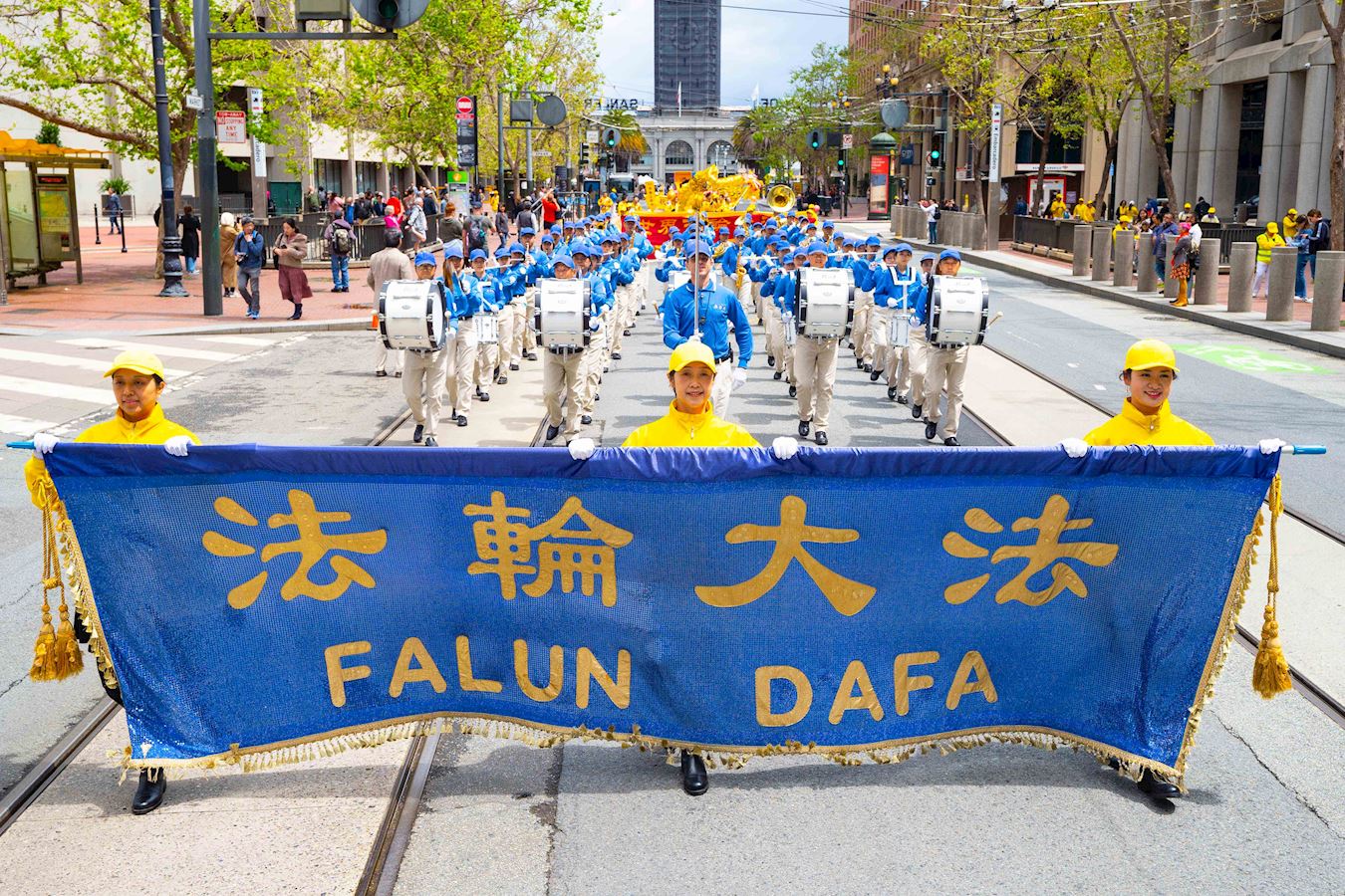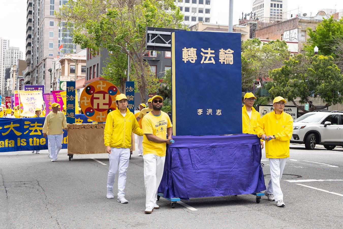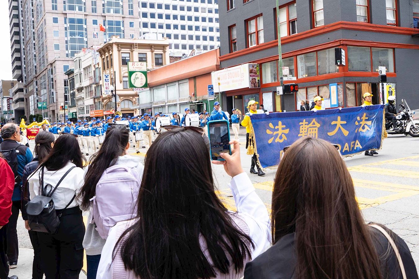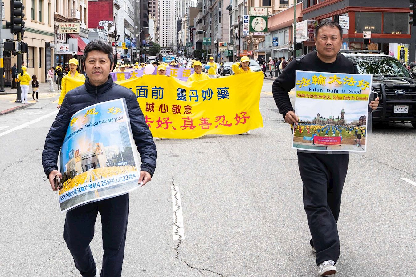 星期六上午九点,法轮功学员首先在旧金山渡轮大厦(Ferry Building)广场前集体炼功,展示祥和优美的功法,庆祝法轮大法日。许多游客被吸引,了解什么是法轮功。还有不修炼的人特地来参加法轮功学员的游行。