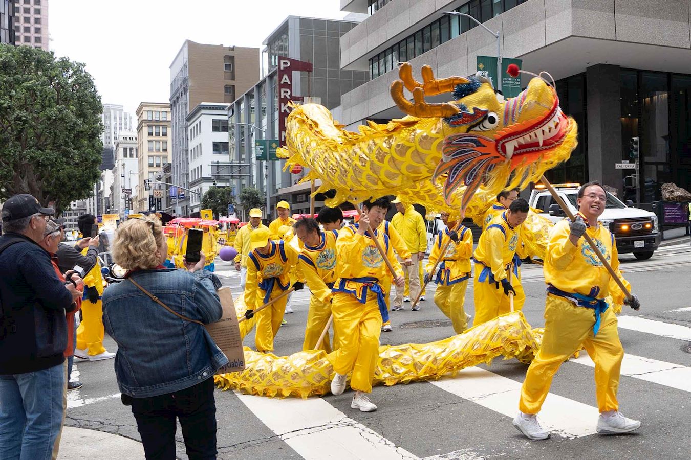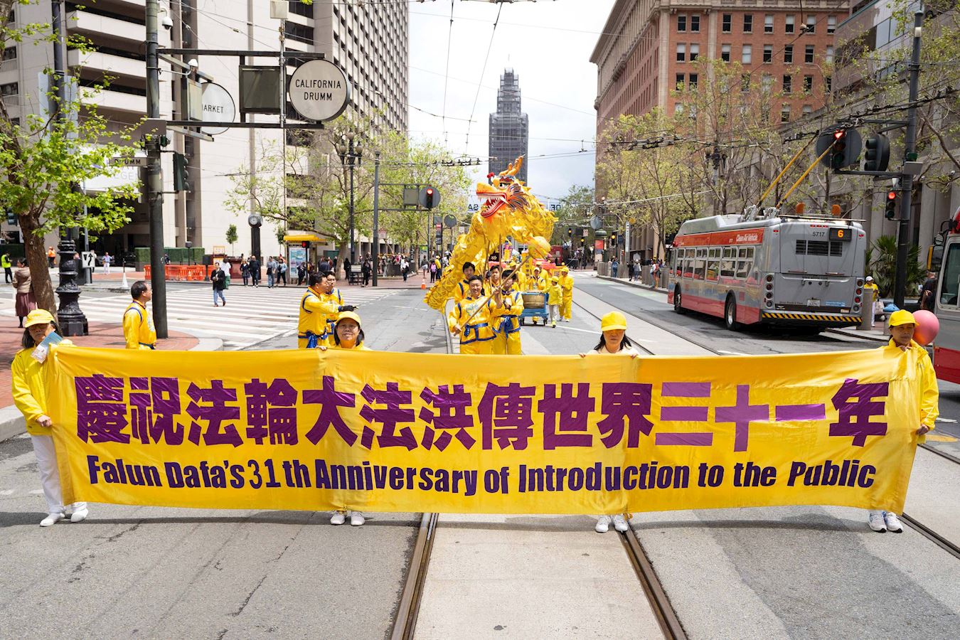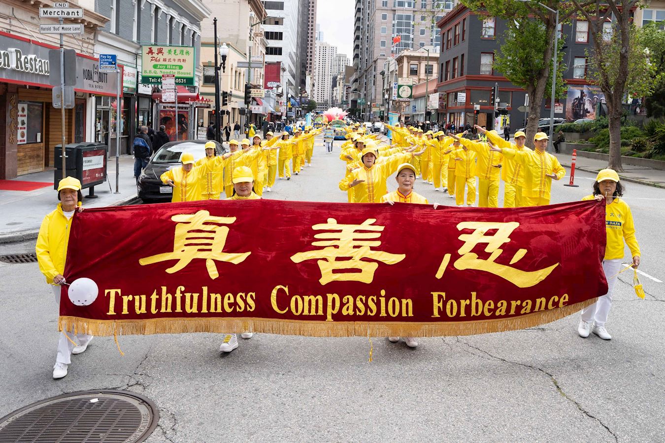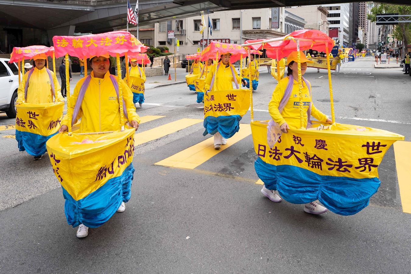 中午十二点,庆祝游行开始。法轮功学员从渡轮大厦出发,沿着市场街,进入唐人街,最后抵达唐人街花园角广场。