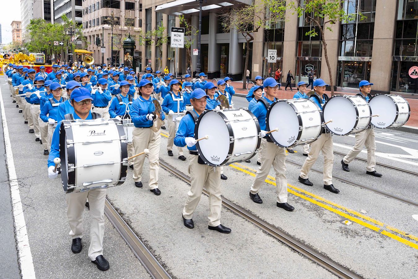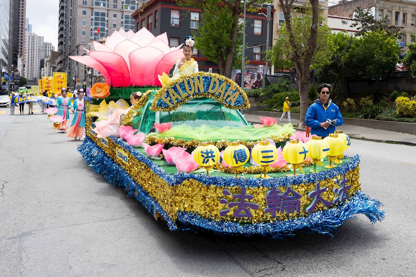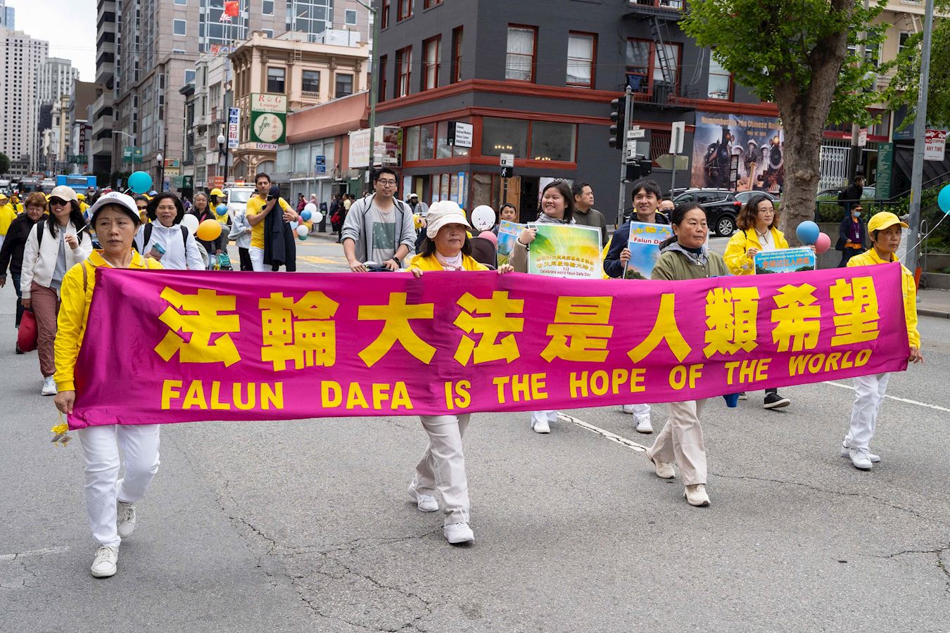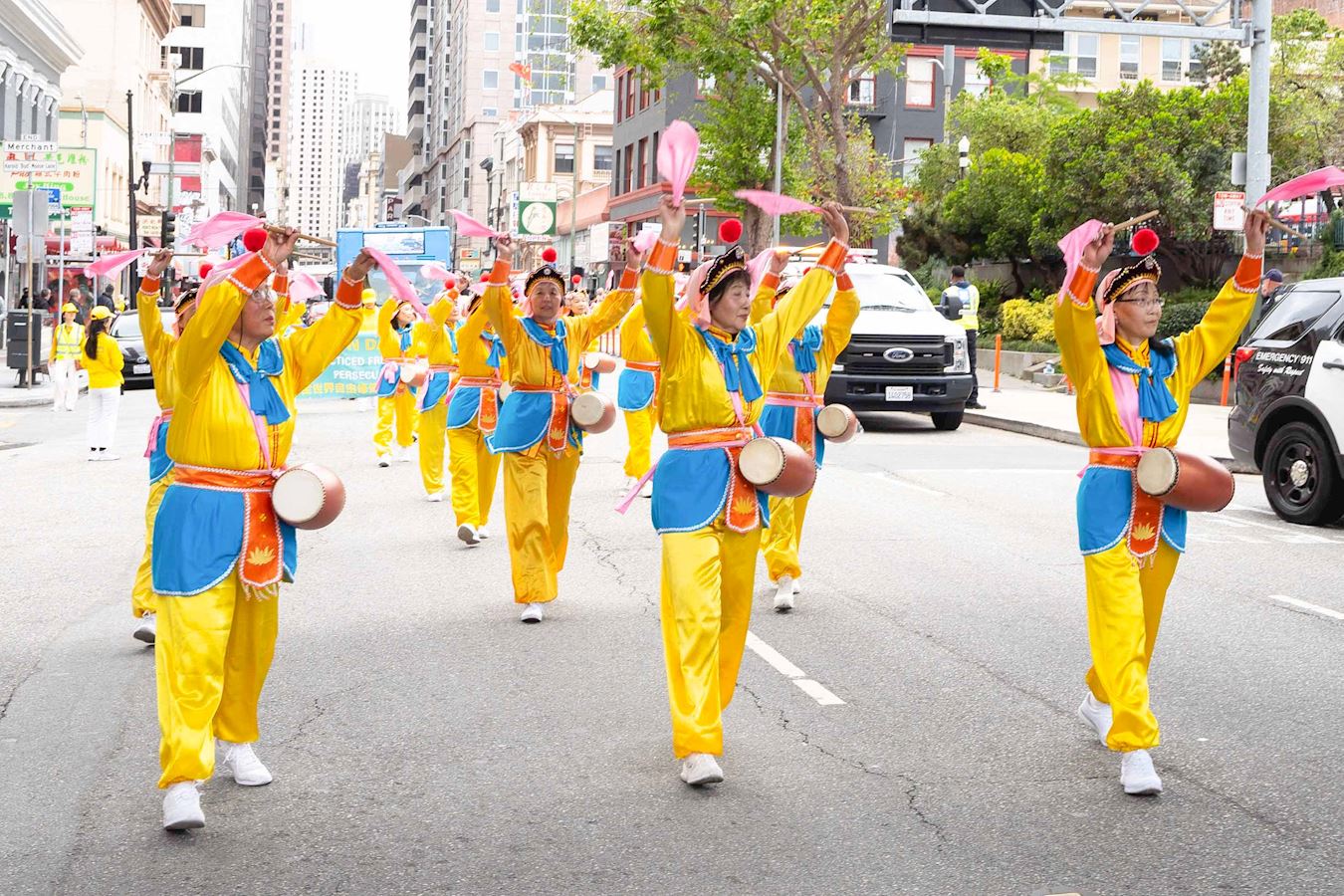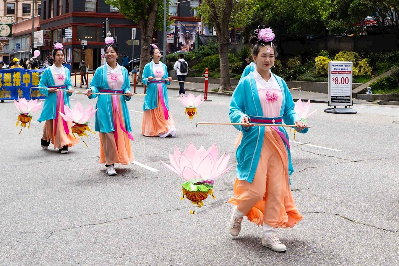 中午十二点,庆祝游行开始。法轮功学员从渡轮大厦出发,沿着市场街,进入唐人街,最后抵达唐人街花园角广场。
