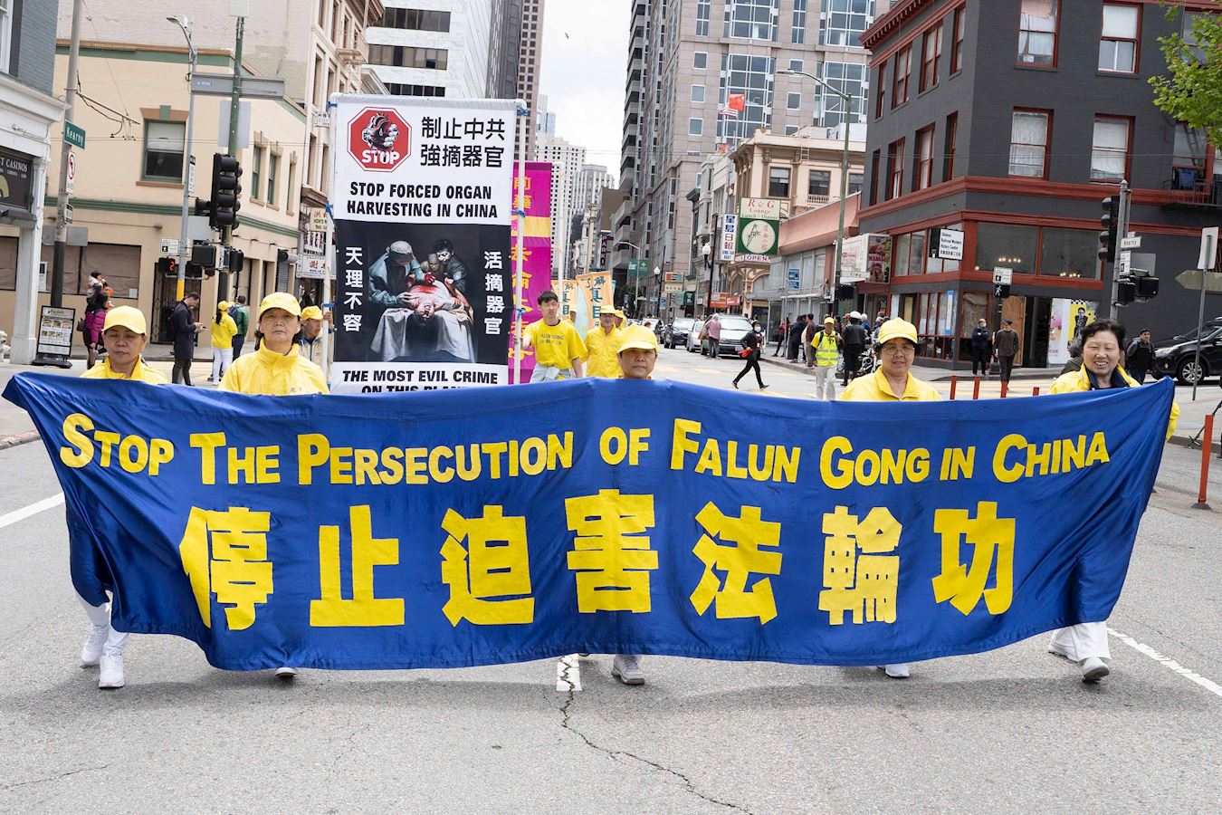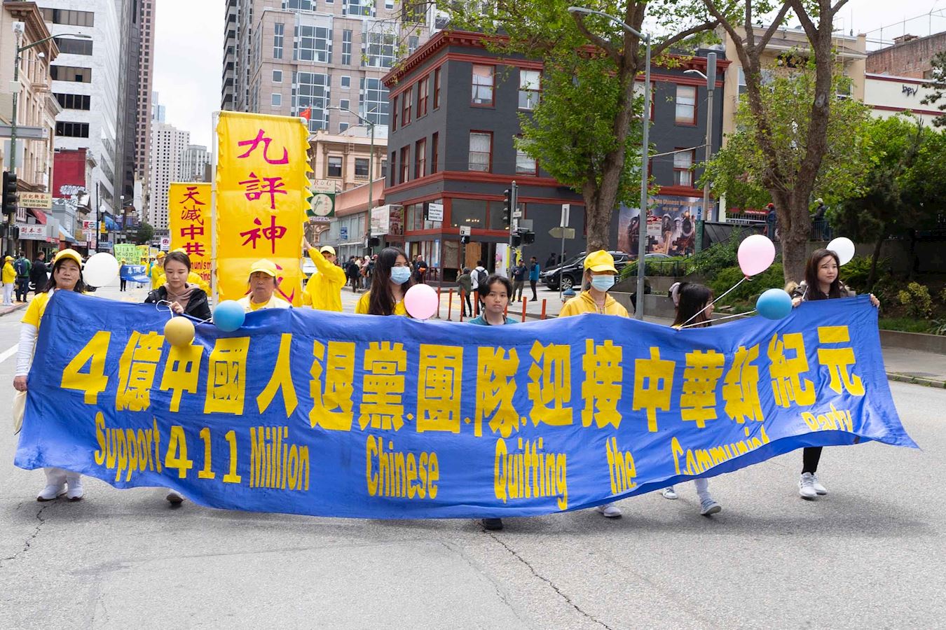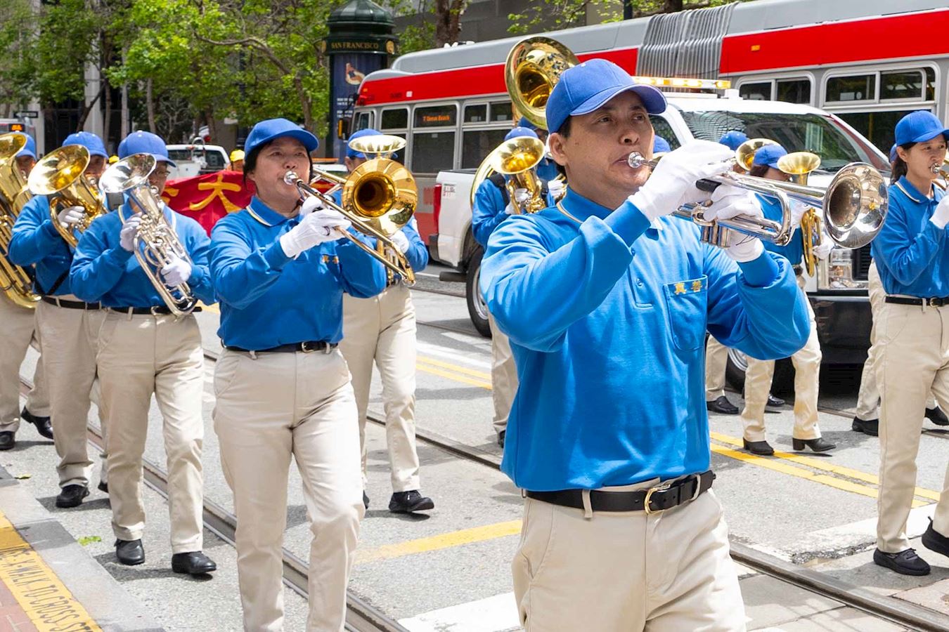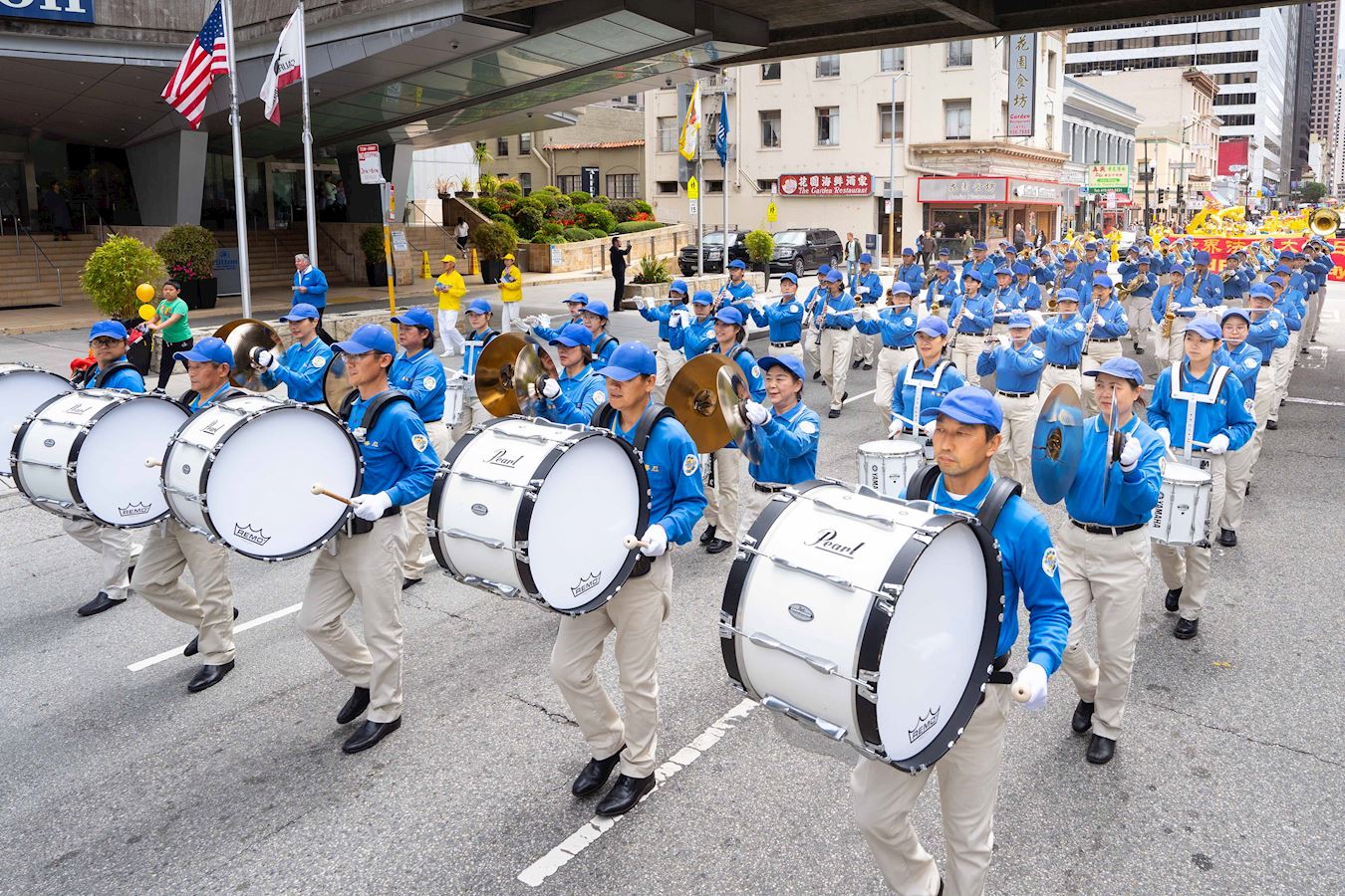 中午十二点,庆祝游行开始。法轮功学员从渡轮大厦出发,沿着市场街,进入唐人街,最后抵达唐人街花园角广场。