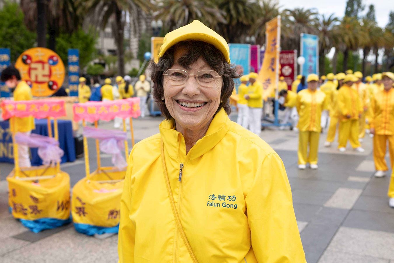 法轮功学员琳达·坎贝尔(Linda Campbell)表示,她今天来这里,庆祝李洪志师父的生日,以及法轮功弘传世界三十一周年。“今天我们在这里举行庆祝活动,同时也与民众分享我们修炼的经历。”