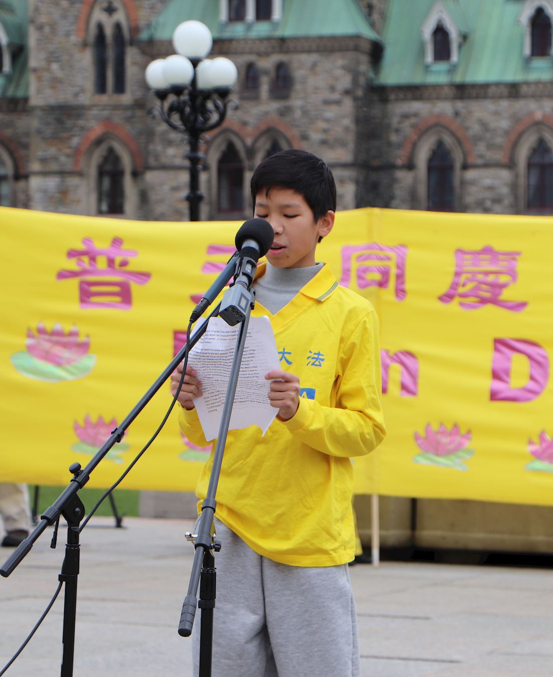 今年十三岁的阿尔伯特(Albert)发言分享了通过大法修炼给他带来的益处。“法轮大法的价值观是真、善、忍,这促使我改变了原有的行为和思想。我过去一直无法控制自己,任何时候都会突然情绪失控。”