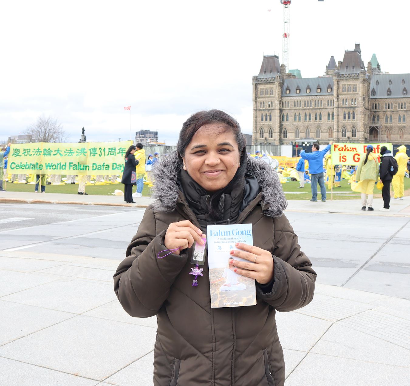 鲁奇女士(Ruchi)是渥太华的一位物业经理,她说:“我来自印度,所以我也知道很多种修炼功法,但是这是我第一次知道法轮大法这个功法。我在很远的地方就看到有很多人在这里打坐,这让我很惊喜,了解后我相信这功法很好。”