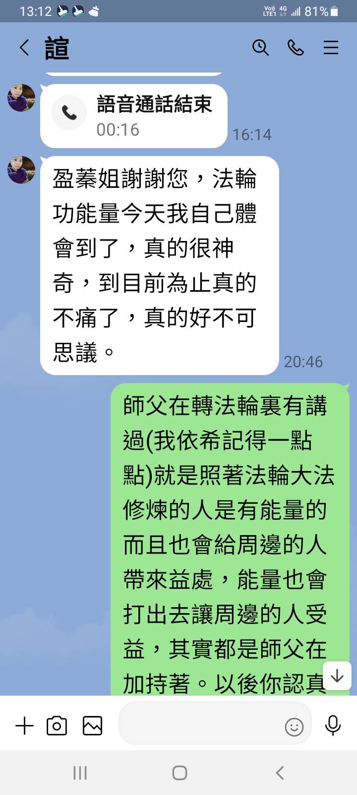 ![]() 图3:盈蓁的朋友用LINE传讯息,说她亲身体会到法轮功的能量。 |