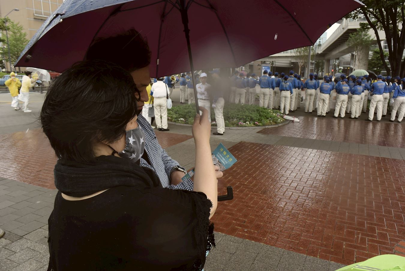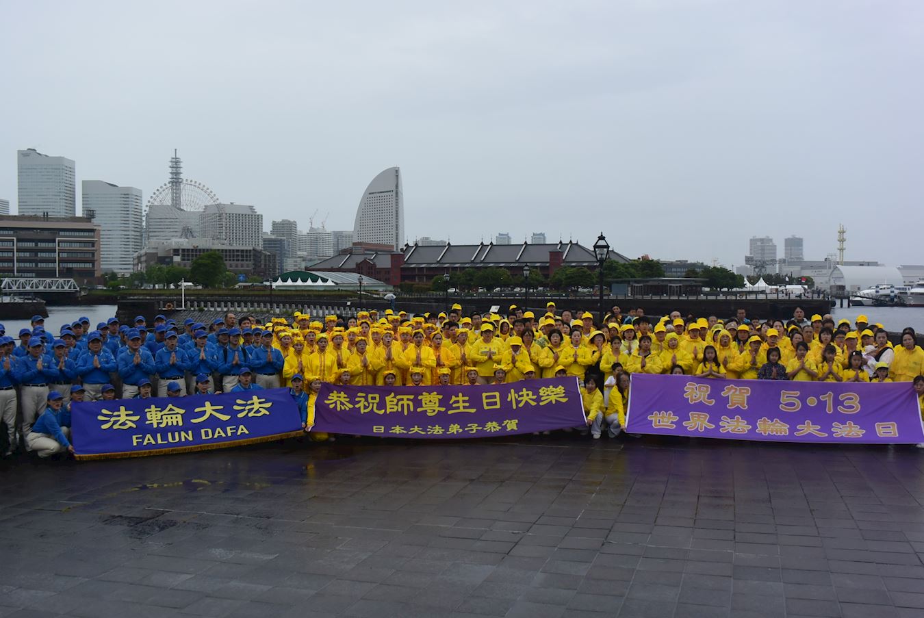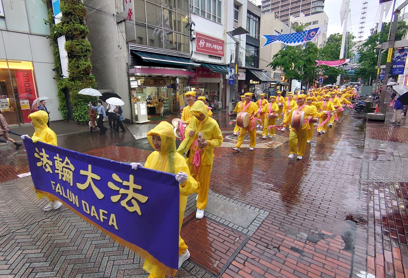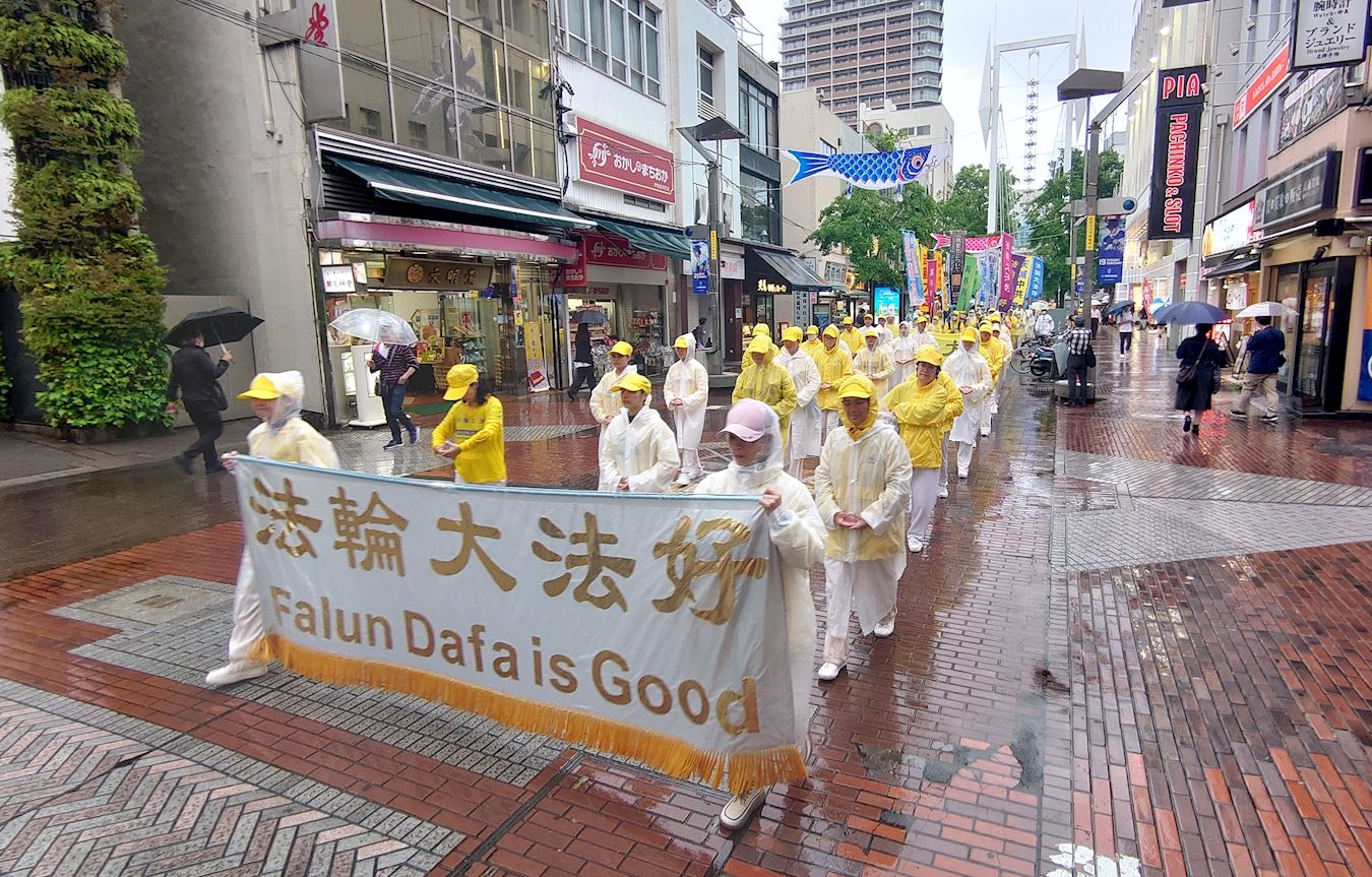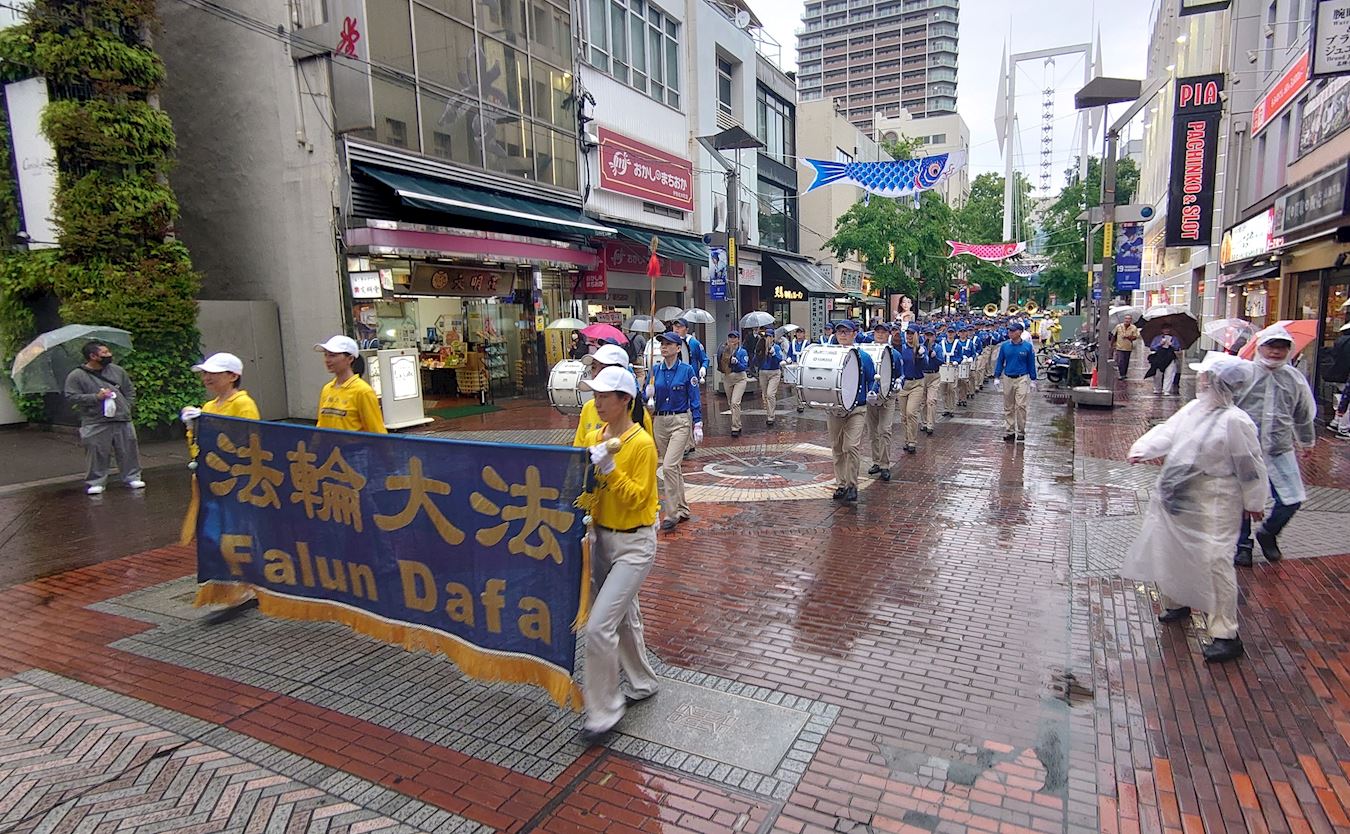法轮功学员冒雨手持“法轮大法好”、“法轮大法在日本”、“四亿一千万中国人退出中共党团队组织”、“打倒中共恶魔”、“中共≠中国”等横幅游行。队伍从横滨市中心的樱木町站前广场出发,由威武雄壮的天国乐团引领,英姿飒爽的腰鼓队压轴,途经横滨市中心、红砖仓库等多个旅游景点,游行队伍展现着大法弘传的辉煌、法轮功学员的和平理性反迫害以及四亿一千万勇士退出中共党团队的壮举。