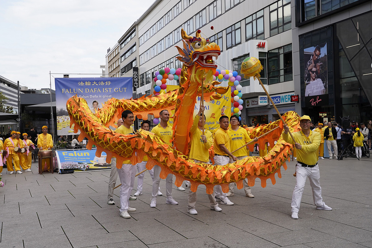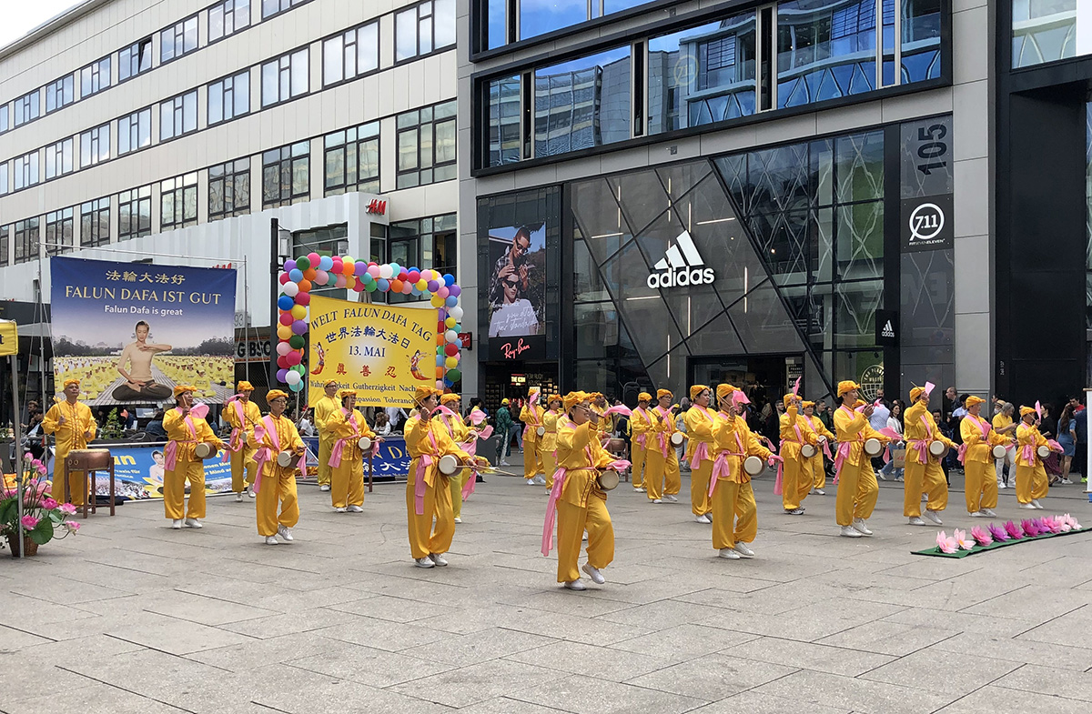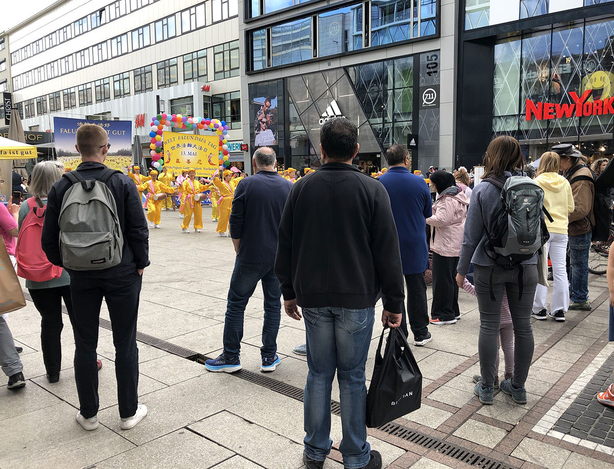 活动当天,彩色气球装扮的、印有“五一三世界法轮大法日,真、善、忍”,“法轮大法好”等字样的横幅格外醒目。身穿黄色服装展示功法的法轮功学员、腰鼓队和舞龙队的精彩表演吸引了众多路人驻足观看。