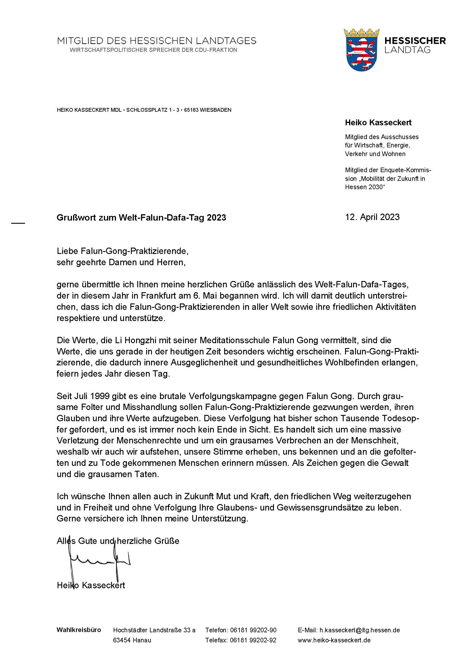 黑森州议会基民盟(CDU)议员海科·卡塞克特(Heiko Kasseckert)发来贺信,衷心的向世界法轮大法日活动致以节日的问候。他明确表示,尊重和支持世界各地法轮功学员及其和平活动。