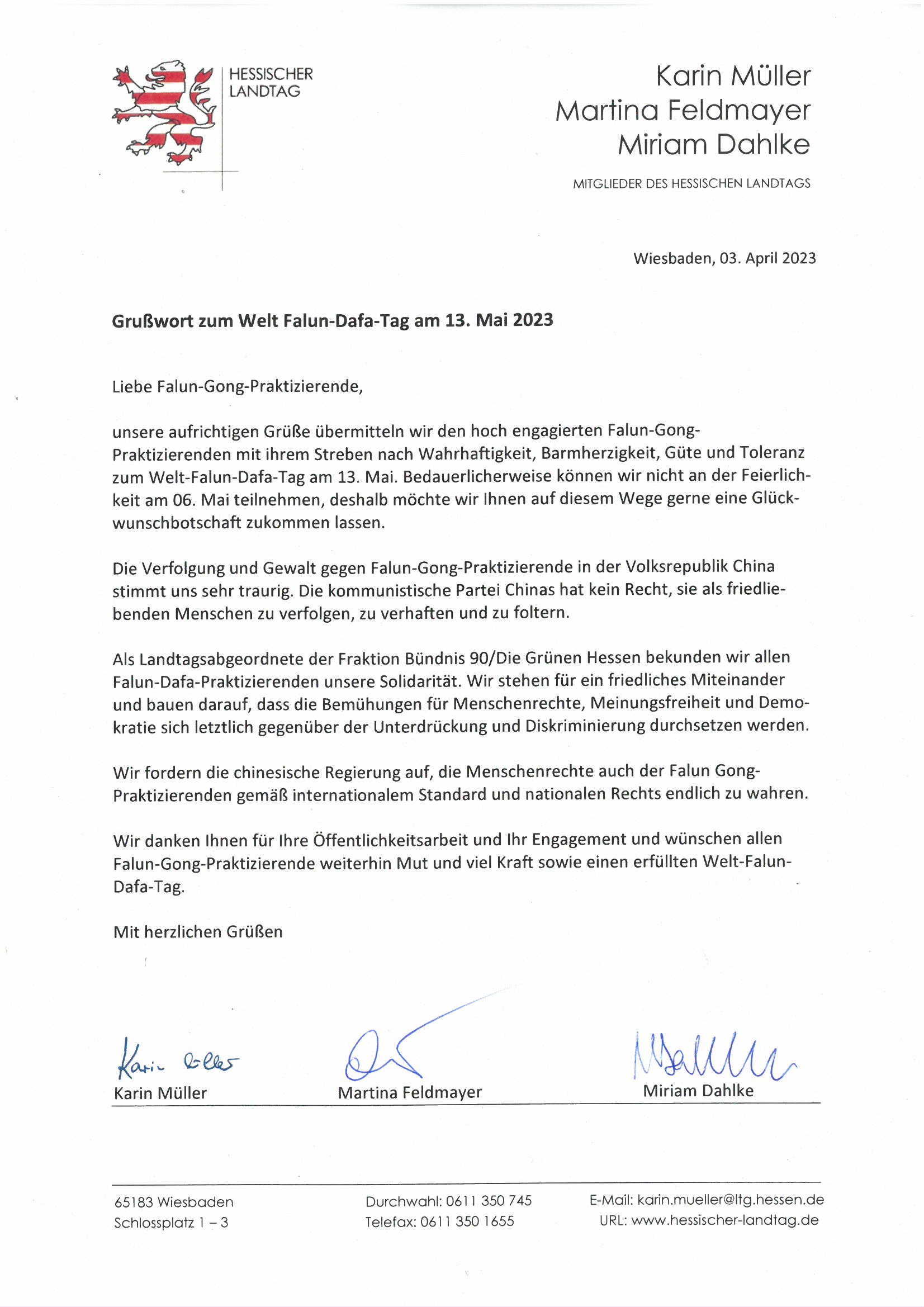 黑森州议会副议长卡琳·米勒(Karin Müller)和两位绿党副主席马婷娜·费尔德迈尔(Matina Feldmayer),米莉亚·达尔克(Miriam Dahlke)也在贺信中给法轮功学员带来了美好的祝愿。