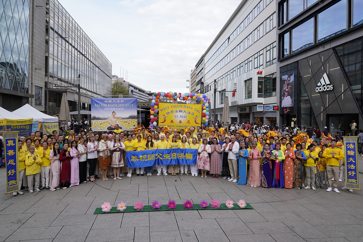 活动现场充满了节日的气氛。悦耳的腰鼓声,英姿勃勃的舞龙表演,祥和的炼功场面,法轮功学员散发着的纯正积极的能量吸引了众多路人。活动快结束时,全体学员合影齐声称颂,“恭祝师父生日快乐。法轮大法好,真善忍好。”欧盟议会议员米歇尔·戛勒(Michael Gahler)到场祝贺并发表演讲。德国黑森州四位政要也发来贺信支持。