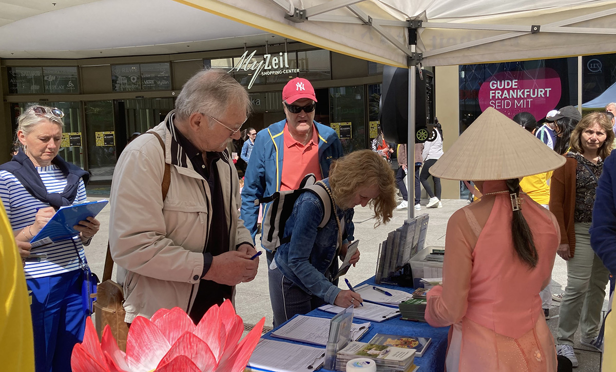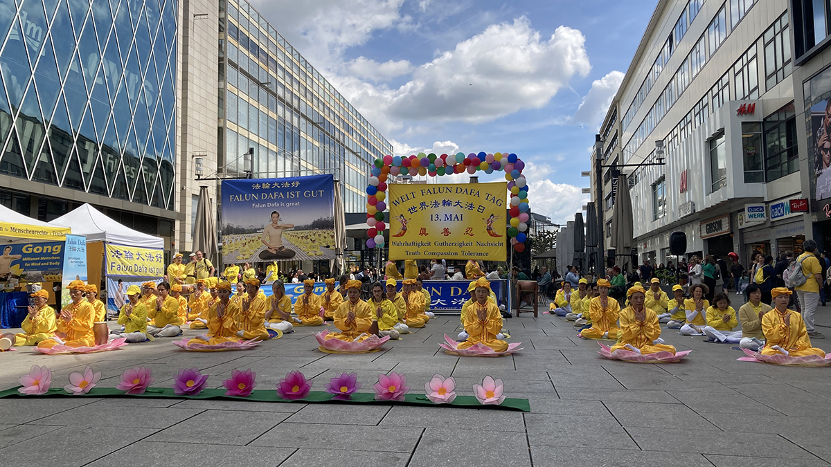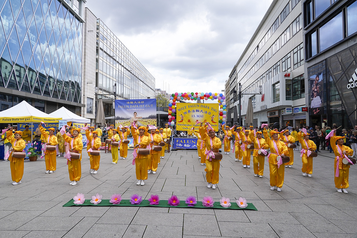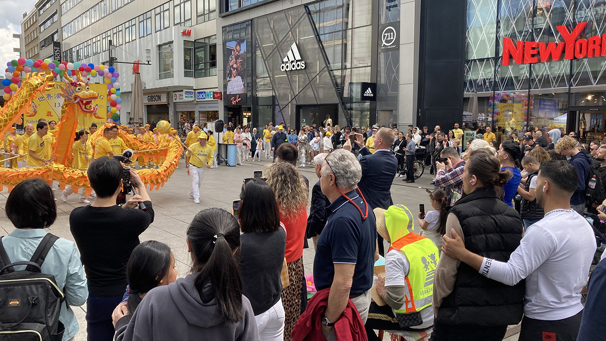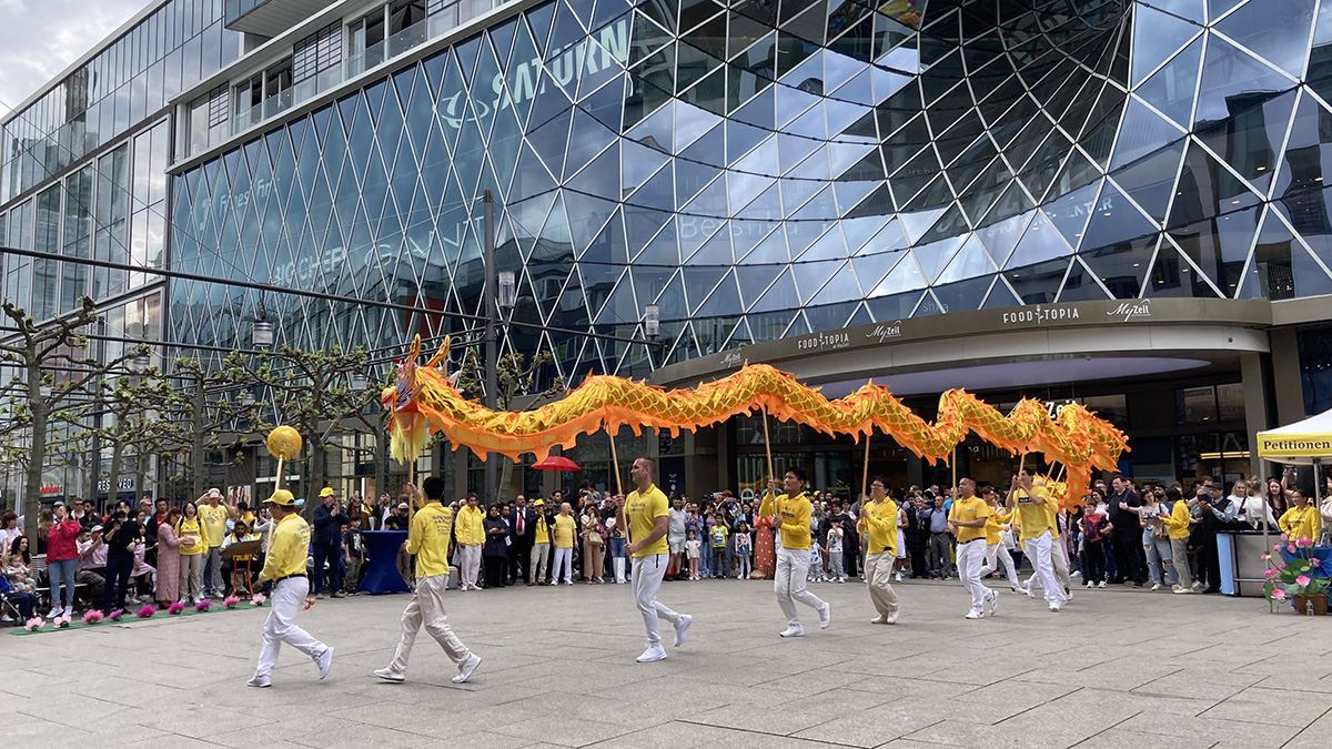 二零二三年五月六日,德国法轮功学员在法兰克福著名的采尔购物中心(My Zeil)前举办大型活动,庆祝第二十四届世界法轮大法日和法轮大法弘传世界三十一周年。