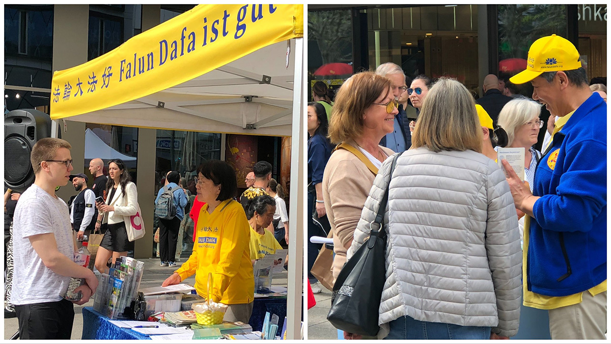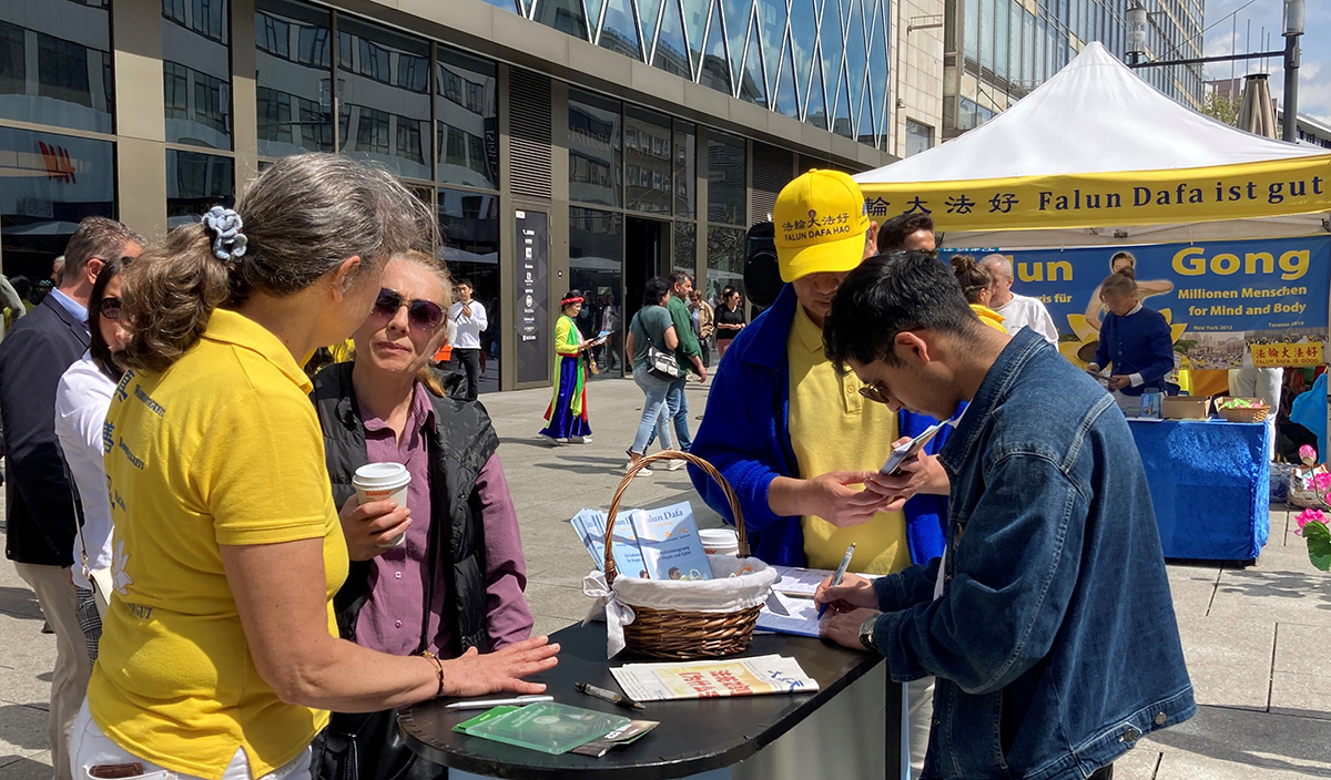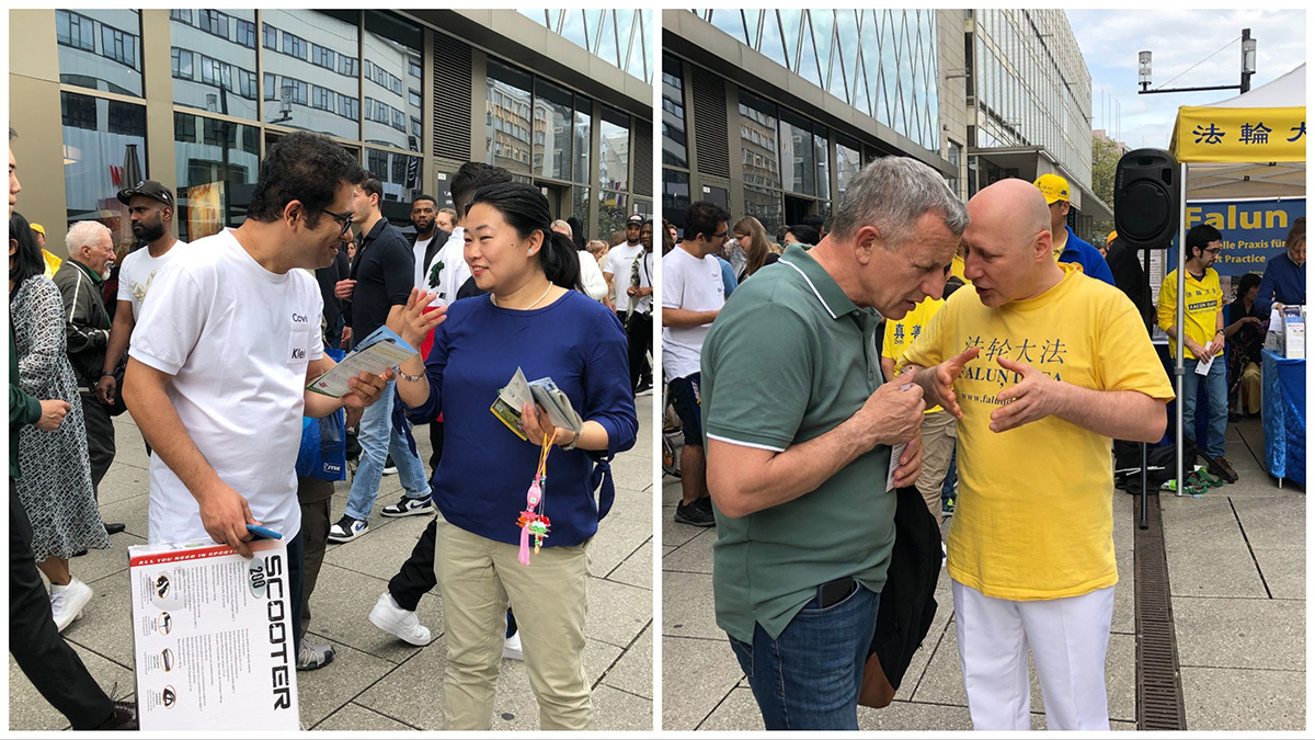 三十岁的斯蒂芬(Stefan)推着自行车来到信息展台前,直接向学员询问宝书《转法轮》。学员向他介绍法轮大法的网址(https://de.falundafa.org)。斯蒂芬马上拿出手机在网上搜索,找到了在线版本的《转法轮》。他表示要回去拜读。