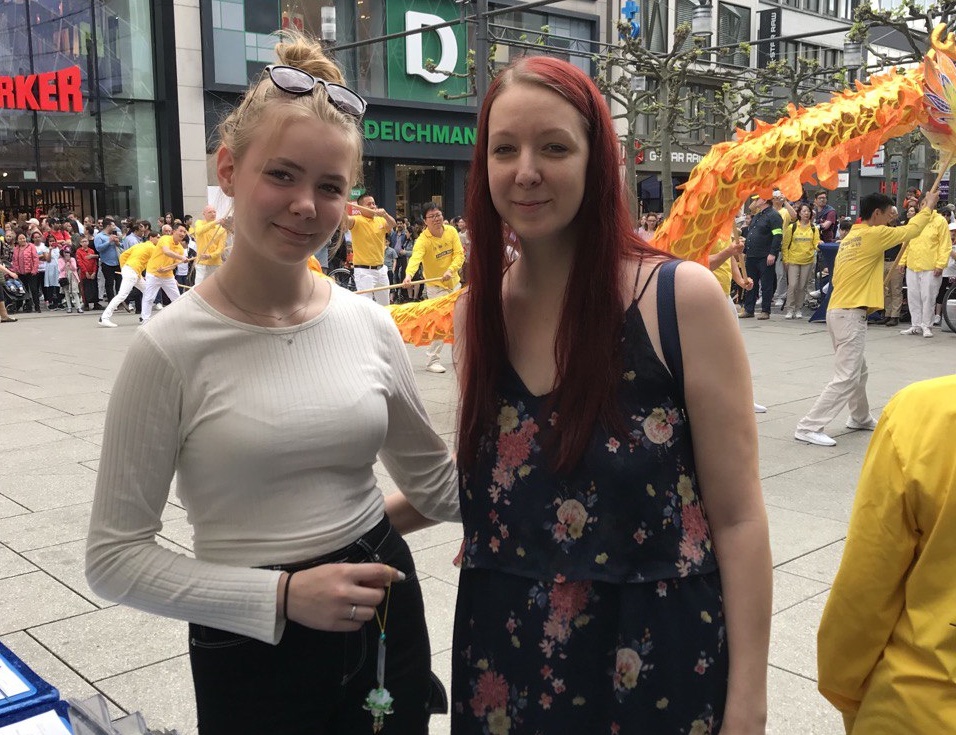 ![]() 图10:科琳娜(Corinna)和女儿艾芙琳(Eveline)观看法轮功学员庆祝大法日的活动,赞同真、善、忍。 |