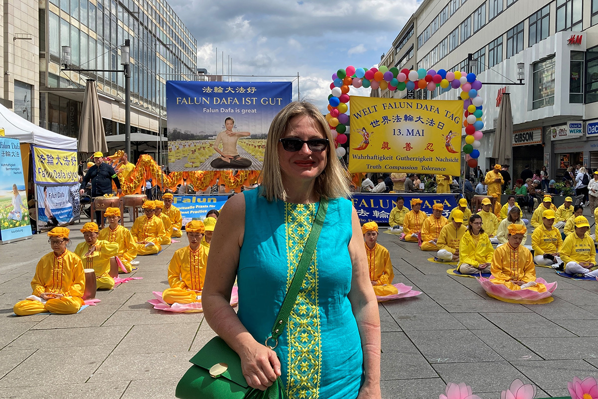 她表示,法轮功学员金黄色亮丽的服装和宁静祥和的打坐场面令人印象深刻。她说:“这些炼功人找到了内心的平静和心灵的喜悦。我也很想尝试一下。”