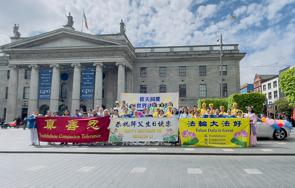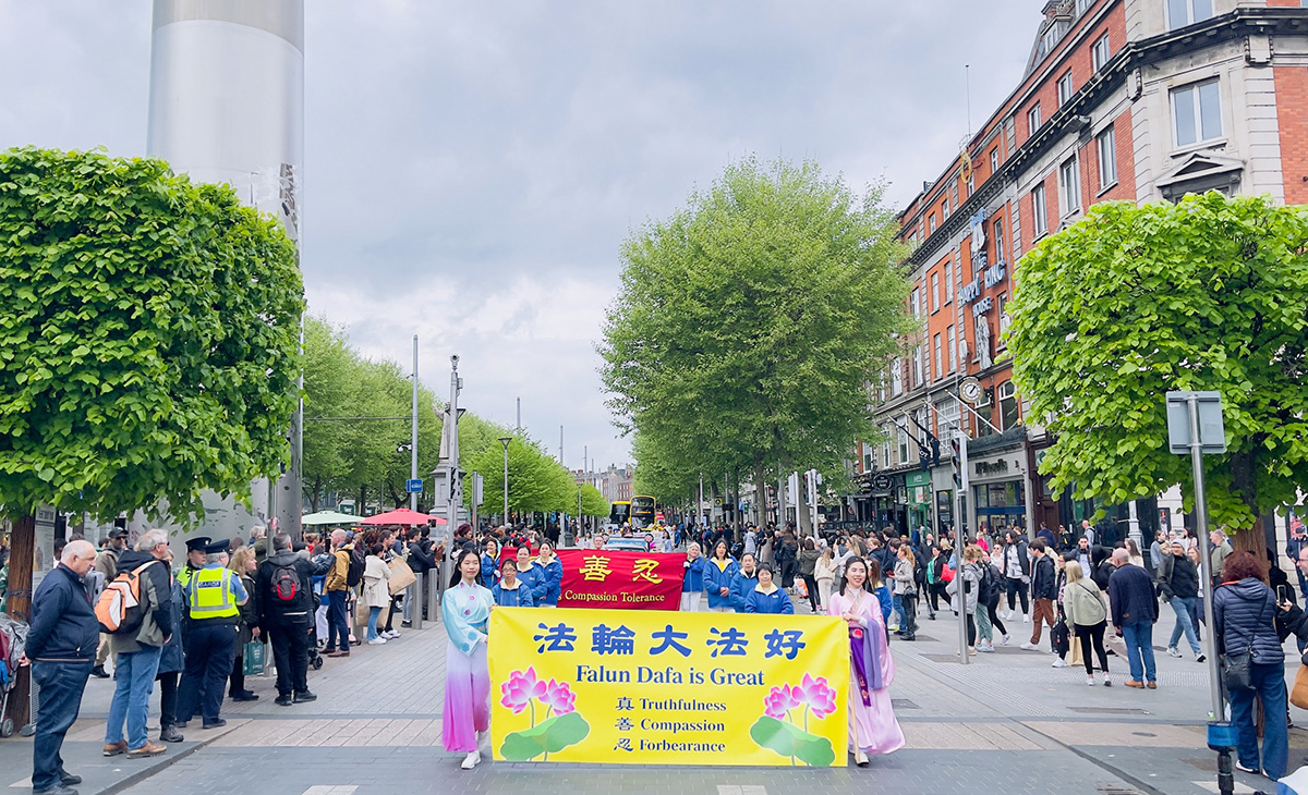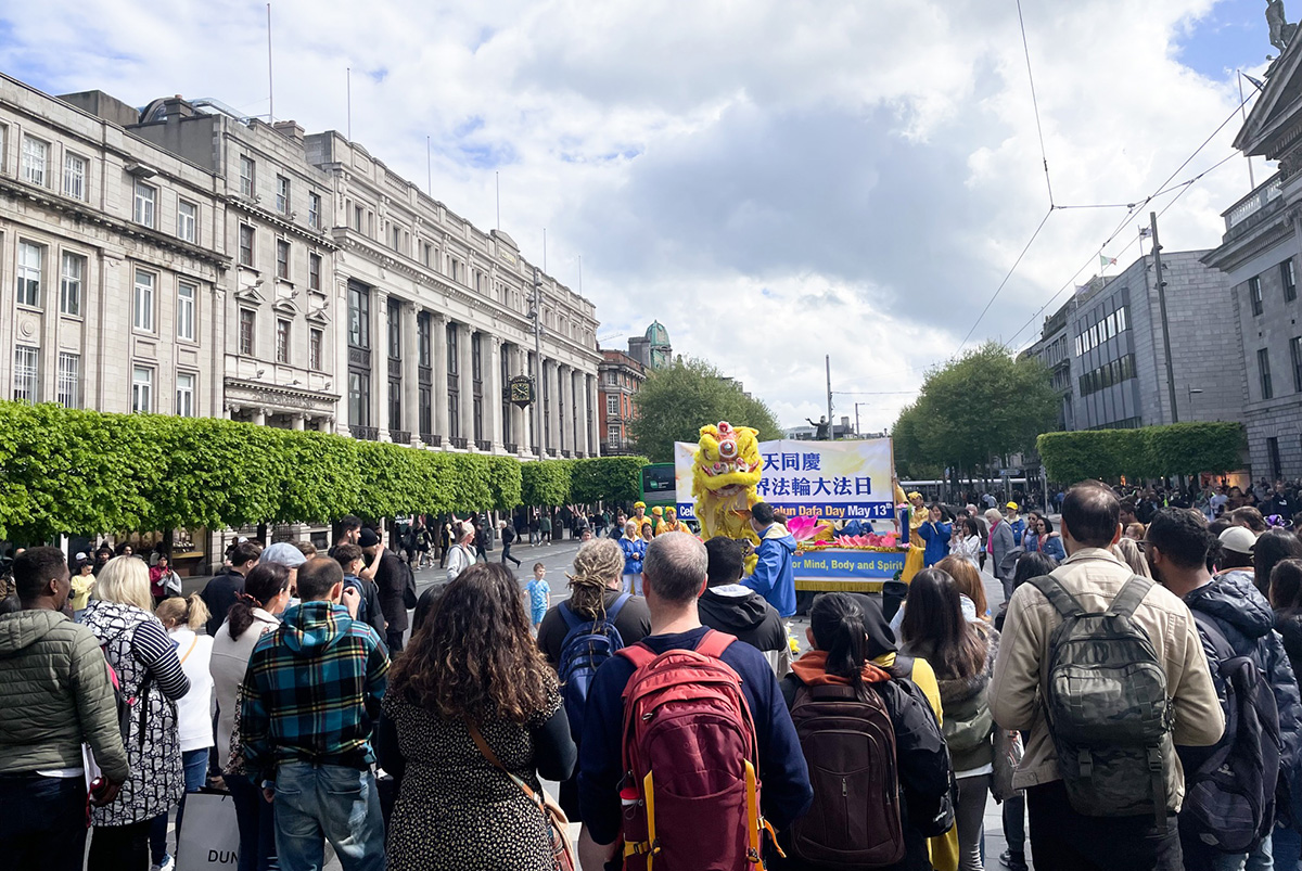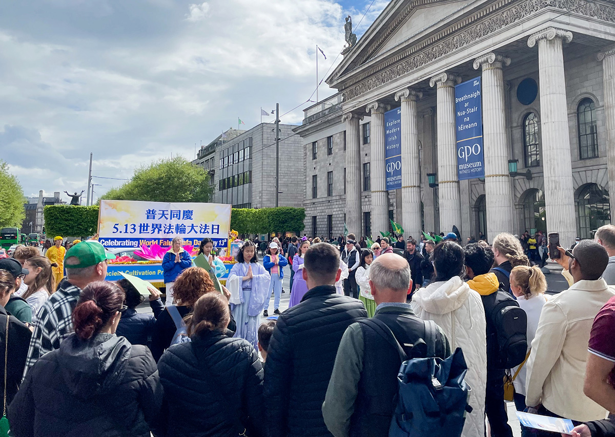 正午时分,在《欢庆大法日》的乐声中,游行队伍从都柏林的纪念花园(Garden of Remembrance)出发。学员持“法轮大法好”的横幅开道,走过华人聚集的帕奈尔大街(Panell Street),进入市中心主干道欧康乃尔大街(O'Connell Street),最后抵达爱尔兰地标建筑邮政总局(GPO)门前。