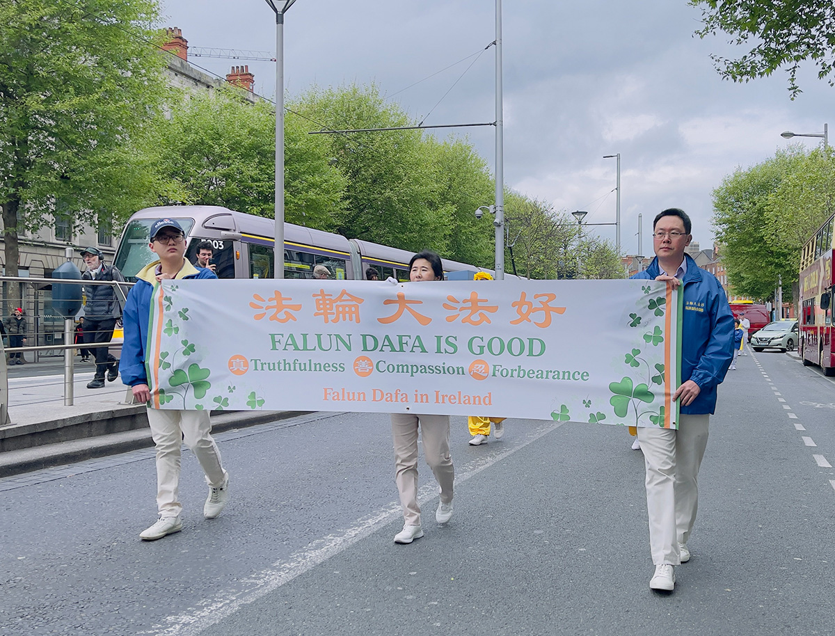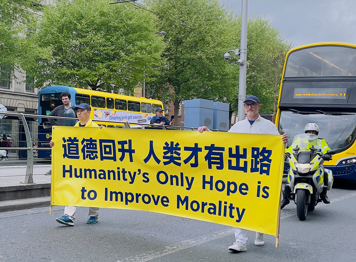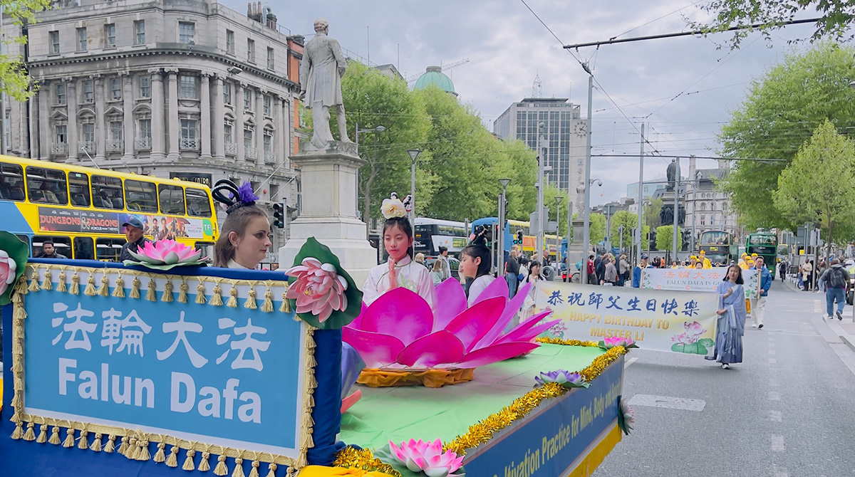 正午时分,在《欢庆大法日》的乐声中,游行队伍从都柏林的纪念花园(Garden of Remembrance)出发。学员持“法轮大法好”的横幅开道,走过华人聚集的帕奈尔大街(Panell Street),进入市中心主干道欧康乃尔大街(O'Connell Street),最后抵达爱尔兰地标建筑邮政总局(GPO)门前。