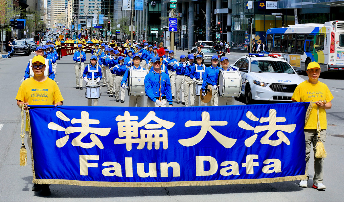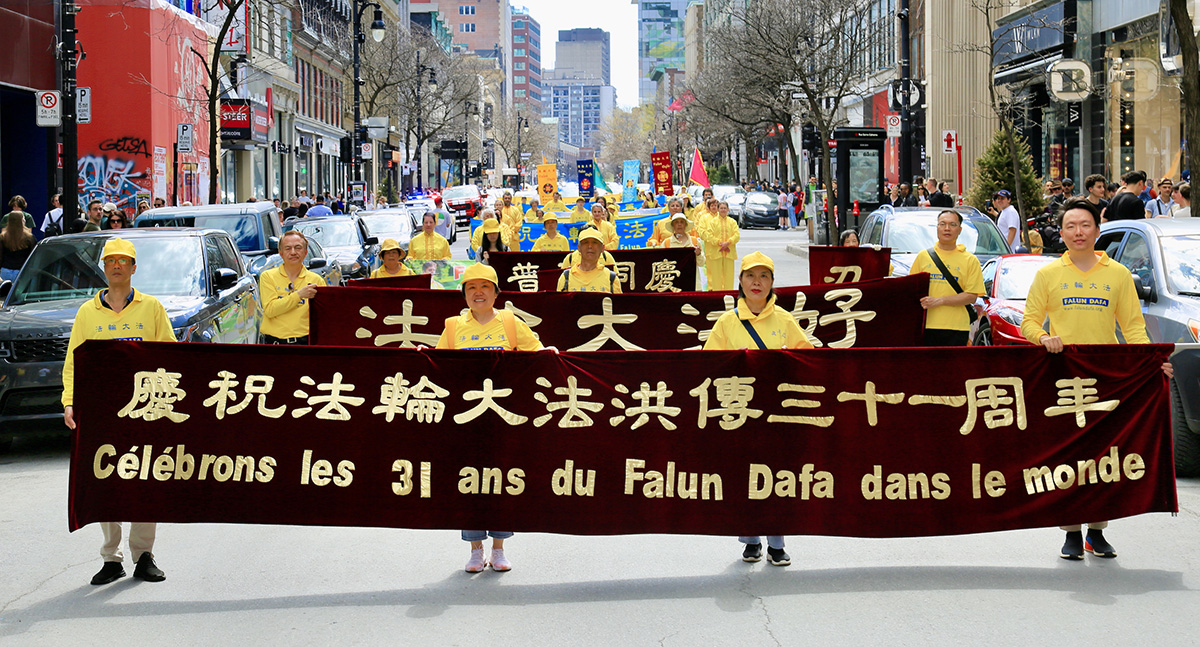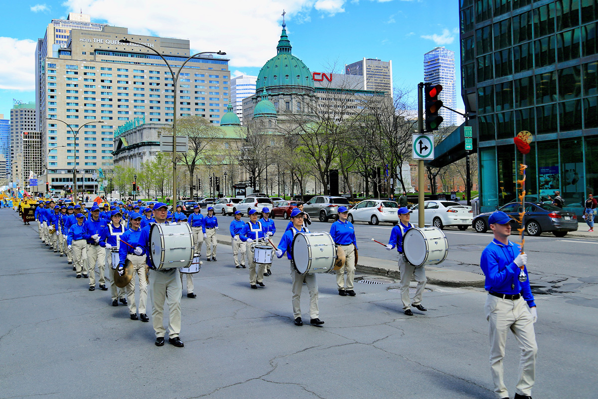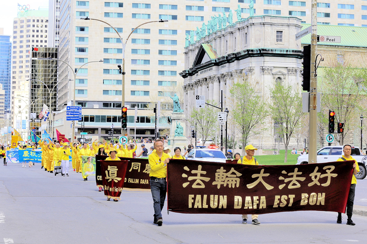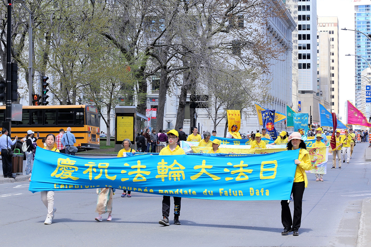 游行队伍下午两点出发,法轮大法天国乐团打头阵,庆祝法轮大法弘传世界主题横幅方阵、功法展示方阵和彩旗方阵紧随其后。游行队伍从蒙特利尔多切斯特广场出发,沿着市中心繁华街区——瑞内勒维克大道、盖伊街和圣凯瑟琳大街行进,抵达终点菲利浦广场。沿途民众看到法轮功队伍纷纷表示“美好”、“平和”、“很感动”。