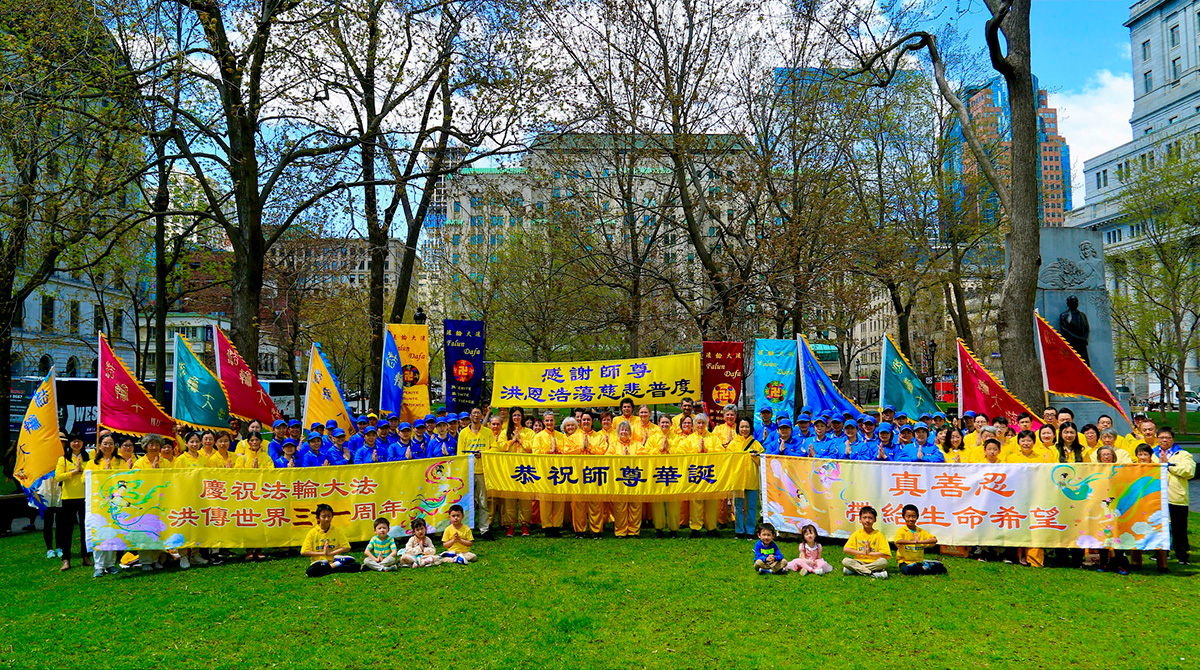 游行出发前,在多切斯特广场,法轮功学员怀着喜悦的心情,双手合十,通过视频恭祝慈悲伟大的师父生日快乐。