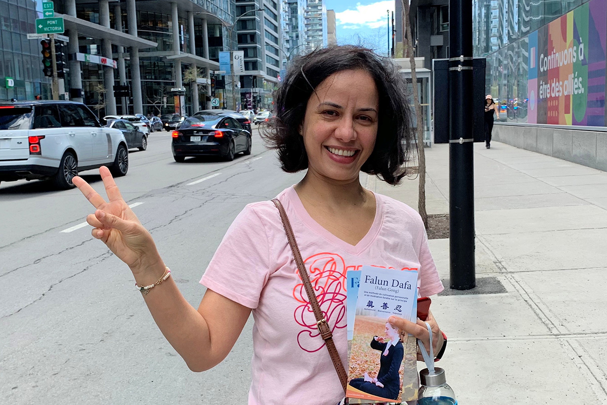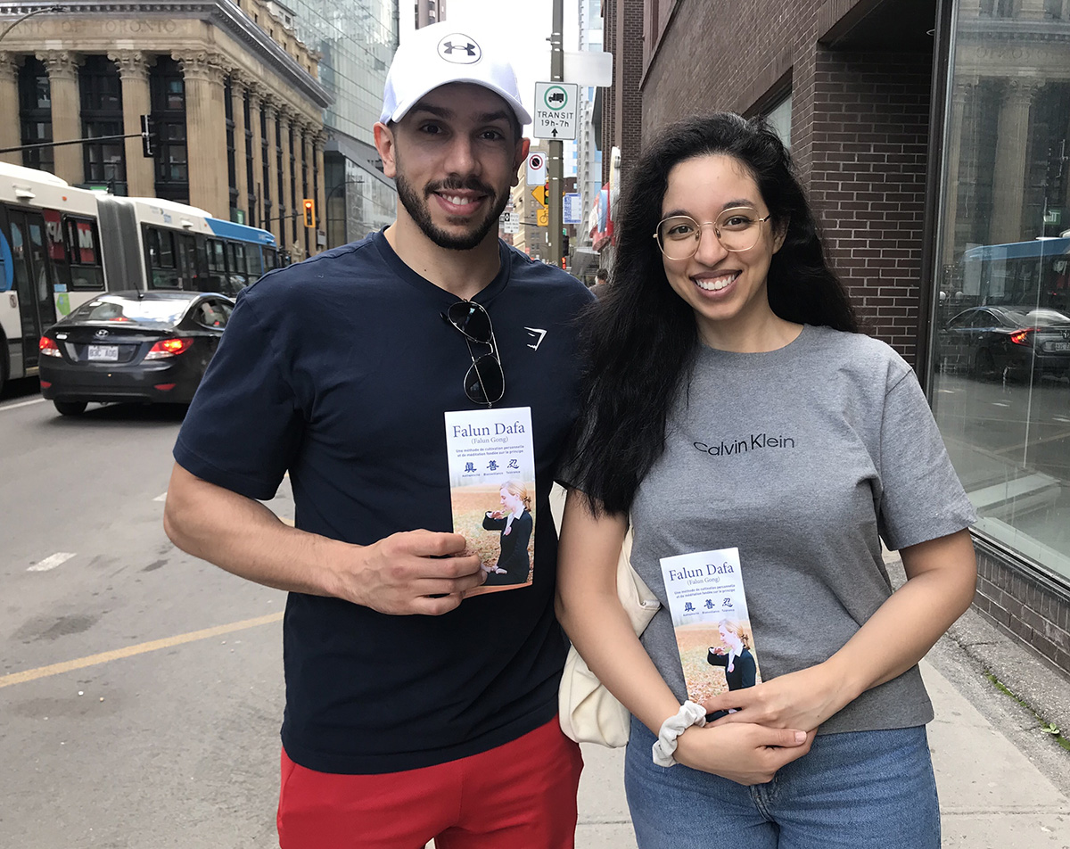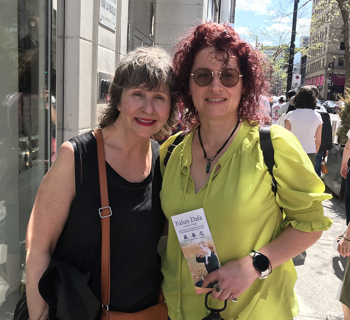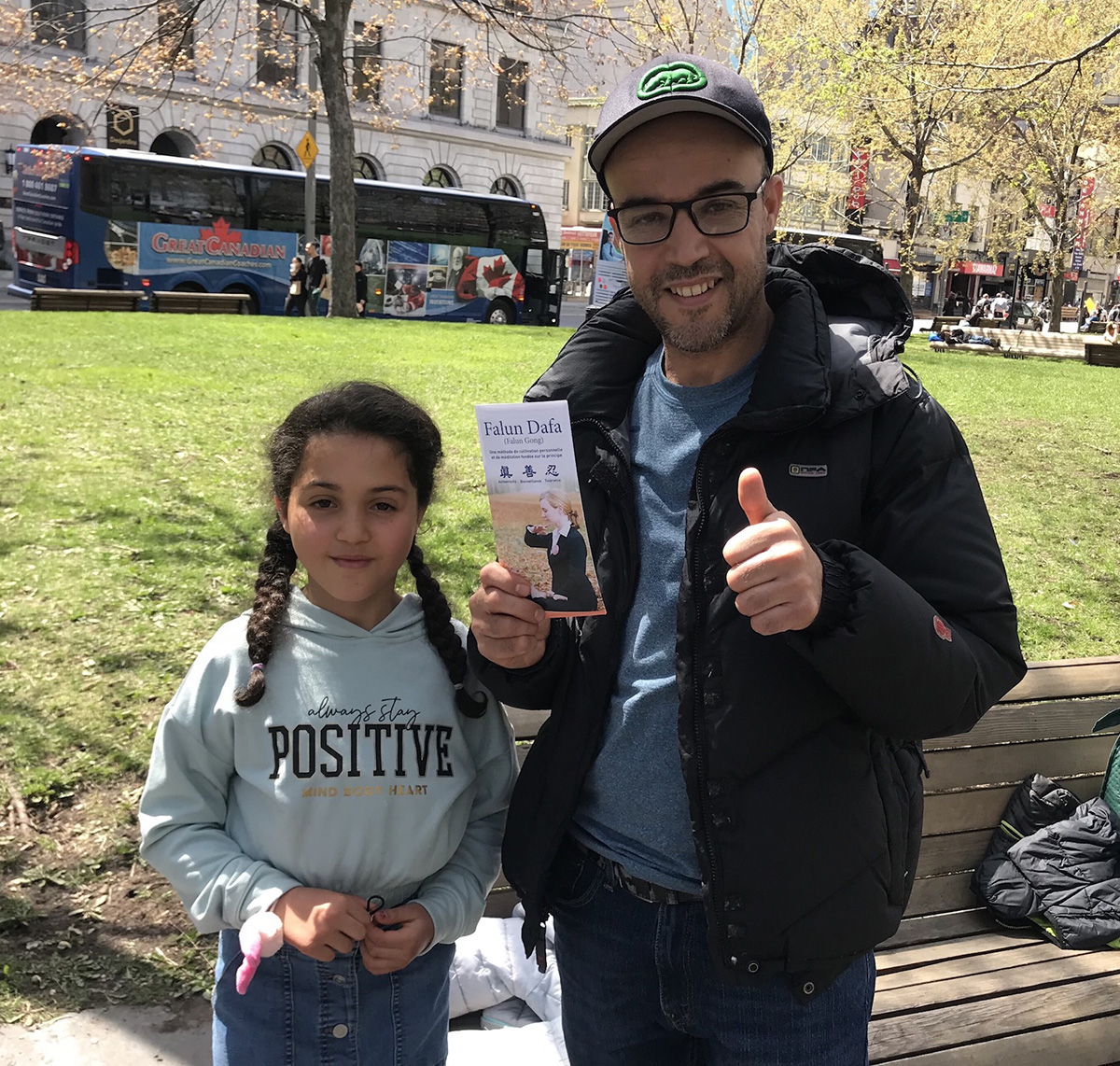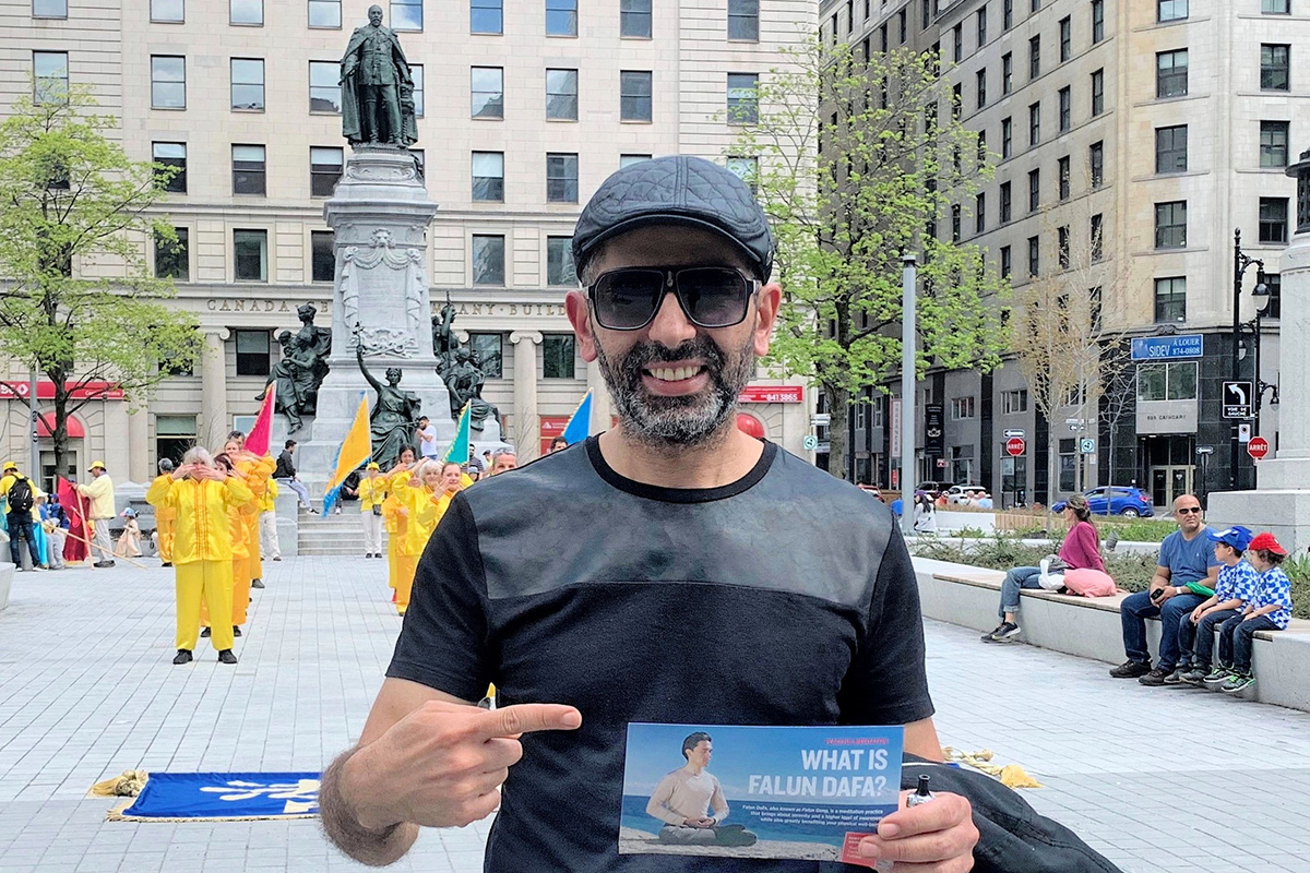 蒙特利尔商人卡里姆(Karim)带着从法国来旅游的侄女到市中心观光,在菲利浦广场他们看到了法轮功学员集体炼功。
