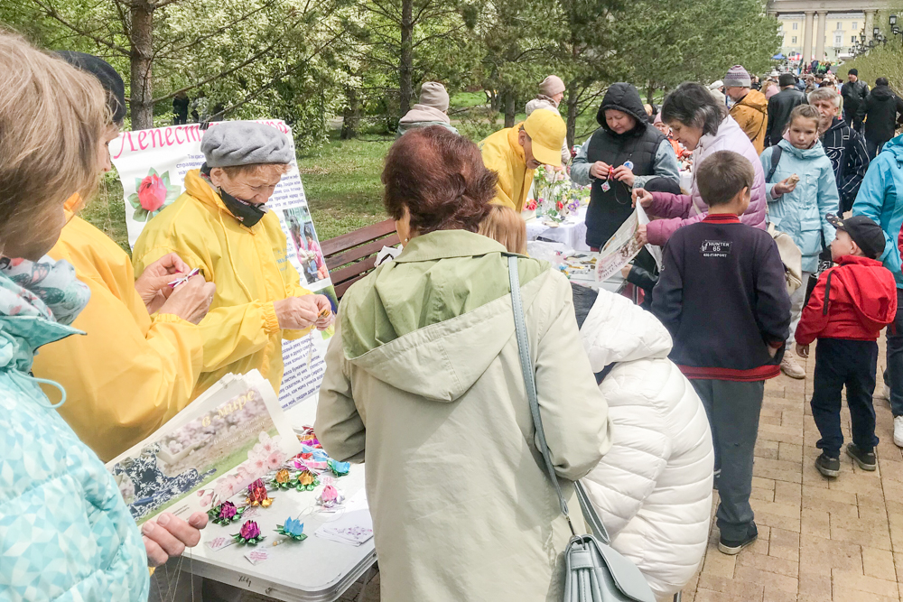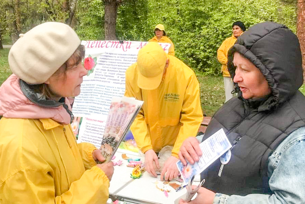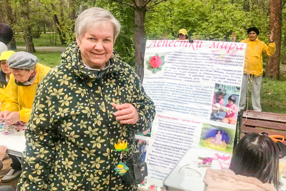 塔玛拉(Tamara)是法轮功之友,有时她会到安加斯基阿尔巴特(Angarsky Arbat)的炼功点与法轮功学员见面。当天在石化公园看到学员弘扬法轮大法,她说,法轮大法对人大有裨益。并说,她早就知道法轮功在中国遭受残酷的迫害,曾多次参加“和平花瓣”活动,制作纸莲花,以唤起人们关注法轮功在中国遭受的迫害。她将许多莲花送给家人和朋友,还向孙女介绍法轮大法,建议孙女在她居住的城市找寻法轮功学员。