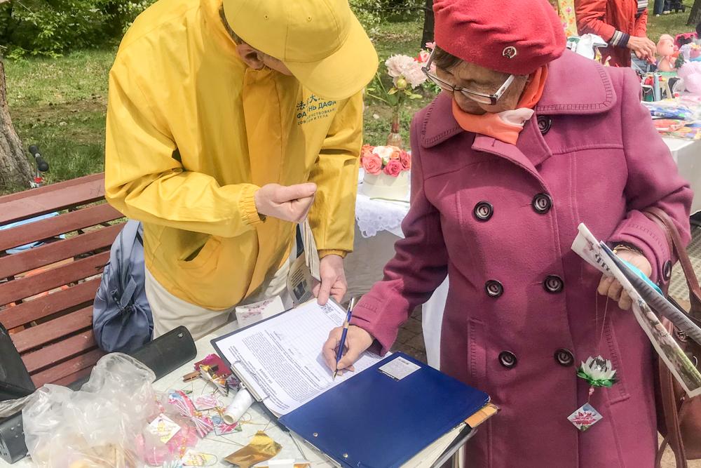 从另一个城市来此游玩的奥克萨娜(Oksana)从来没有听说过法轮功。听完学员介绍法轮大法后,她说,看着自己九岁的孙子,她明白,社会道德下滑,给儿童带来深重的伤害。这样的氛围使孩子们失去了善心和对长辈的尊重,他们变得紧张不安,不听话。