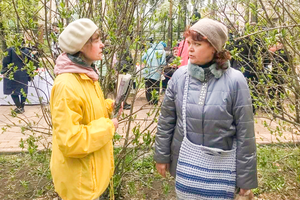 ![]() 图4:奥克萨娜(Oksana,右)与法轮功学员交谈。 |