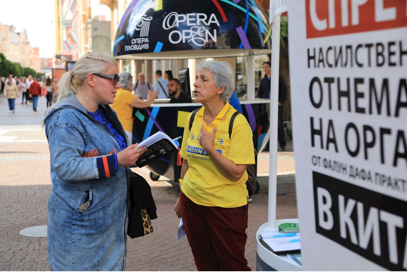 一位名叫萨尼塔的年轻妇女先在请愿书上签了名,然后询问:“(迫害)证据是如何收集的?在哪里可以看到?”一位学员回答了她的问题,并送给萨尼塔一本保加利亚语翻译的《血腥的活摘器官》,该书记录了中共活摘器官的证据。