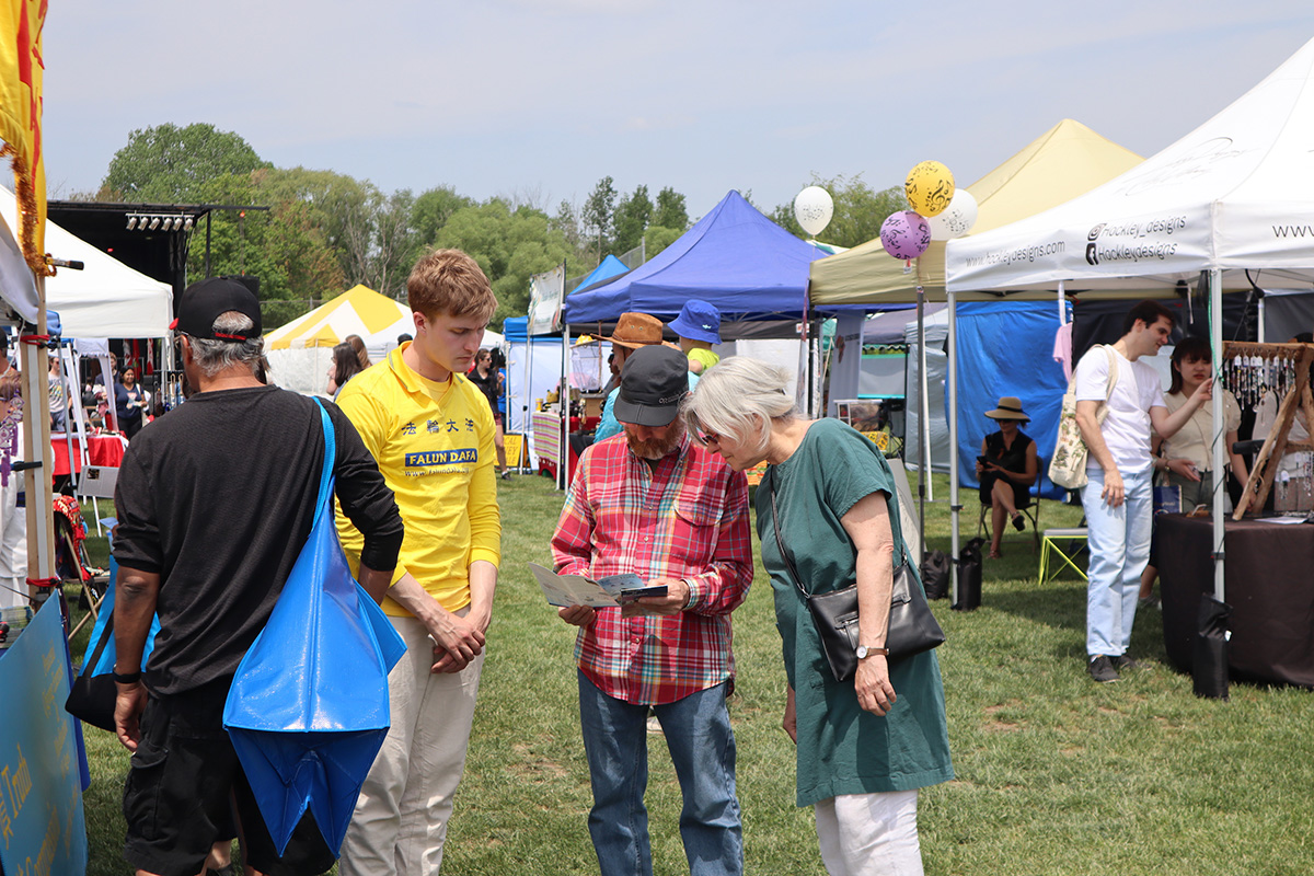 胡安(Juan)在大法展位前翻阅着桌子上的《明慧国际》杂志,在学员要向他介绍大法时,他对学员说:“我以前在电视新闻上听说过中共对法轮功的镇压,以及对学员的迫害。我在这里看到法轮功的展位,很想问问法轮功是什么?”