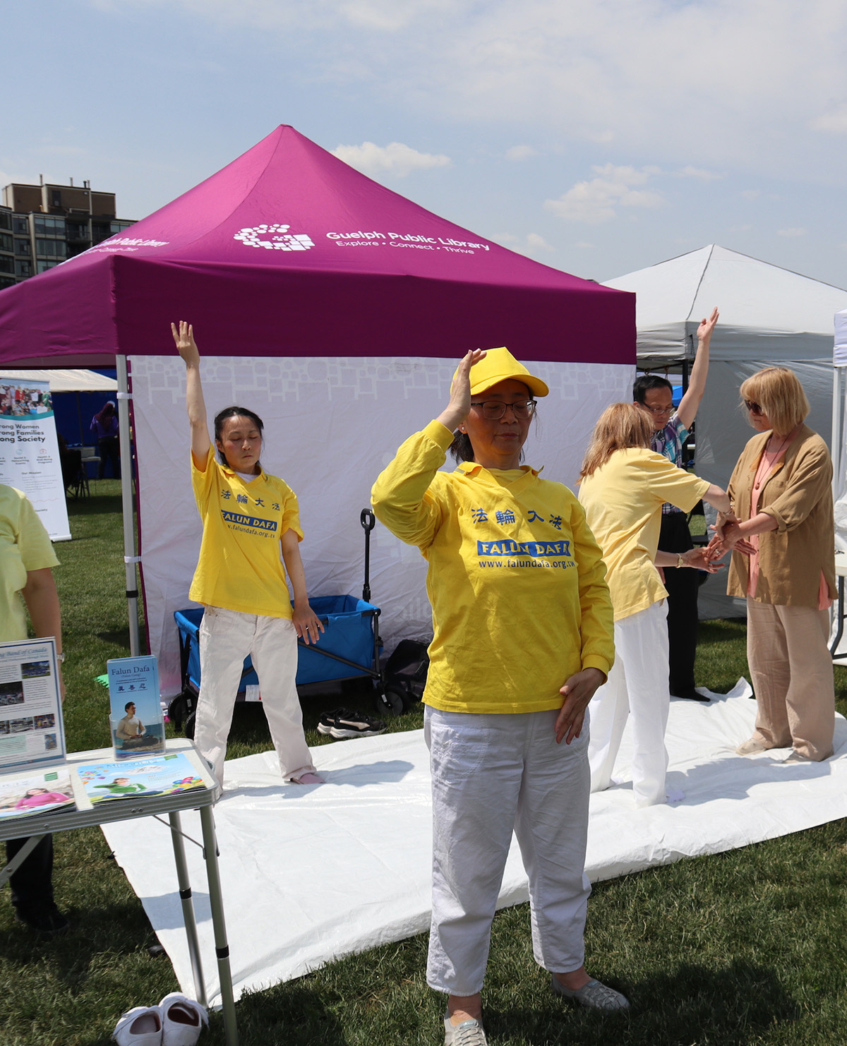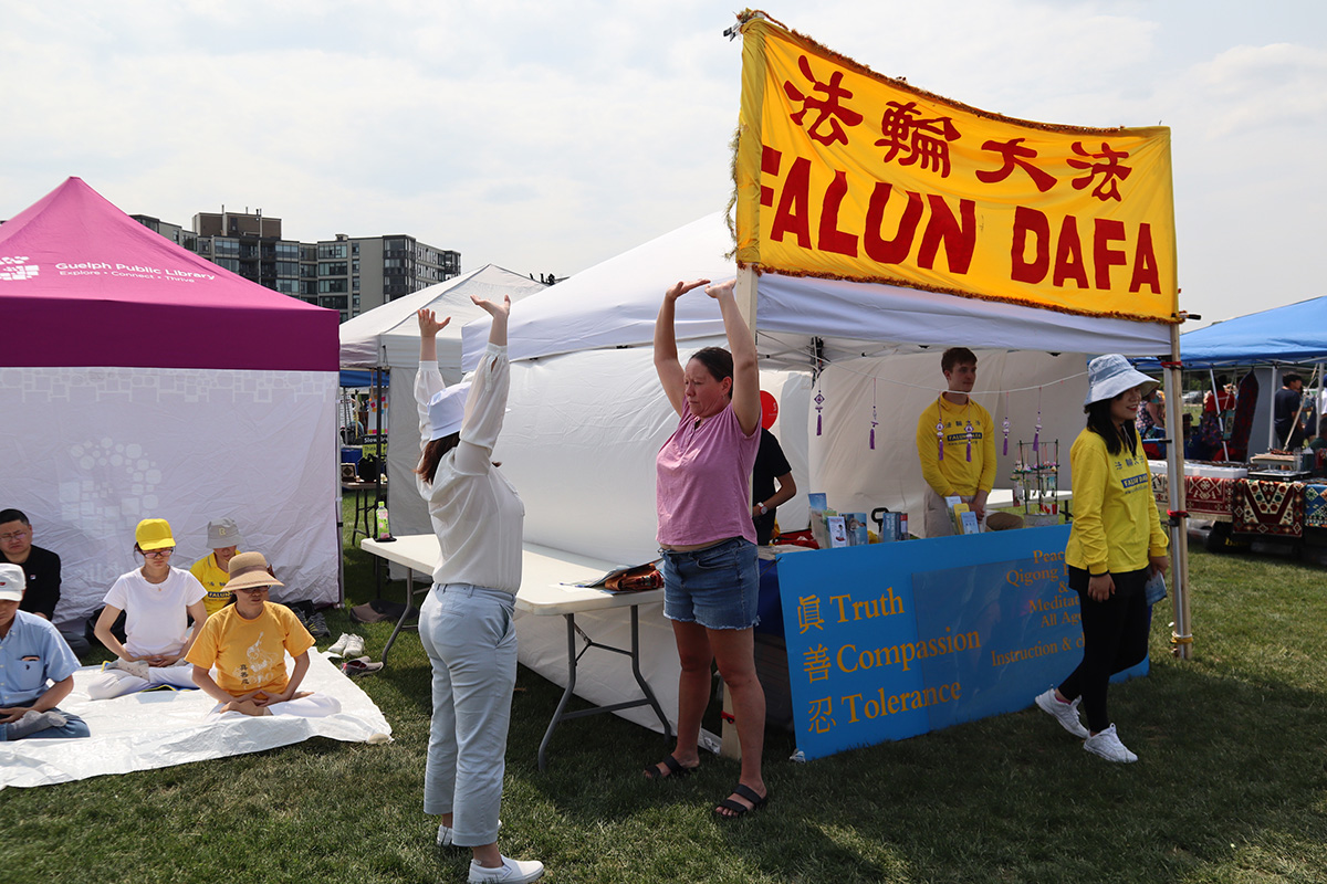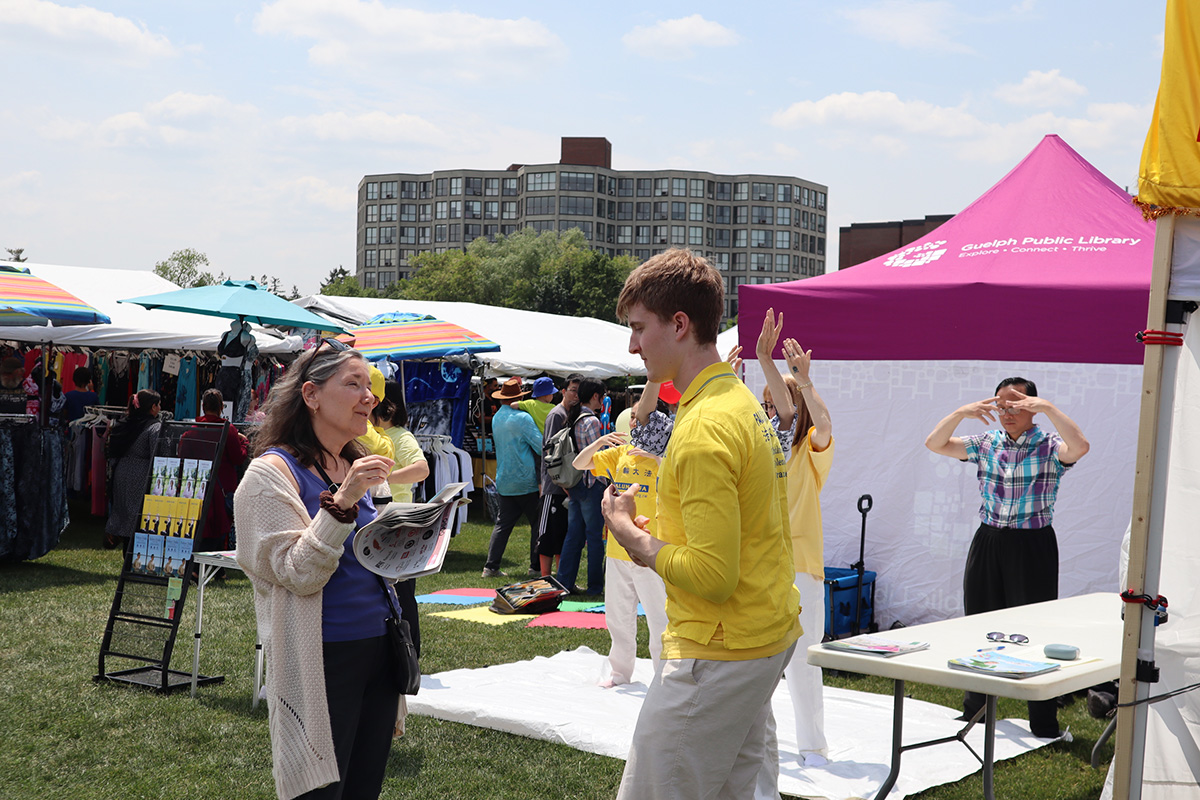克丽丝(Chris)是圭尔夫当地居民,她是一名办公室员工。在听完学员对大法的介绍,以及跟着学员学炼了功法动作后,她说,“这是我第一次听说法轮大法。在路过展位时,当我看到学员们在炼功,立刻被他们平和、放松的状态吸引了,那是从内而外散发的,我能感受到。所以,我想过来跟学员学炼功法。虽然我只学了一小会儿,也是刚刚入门,但我感觉内心平静、稳定多了,我切身感受到了炼功给我的内心世界带来的变化。”