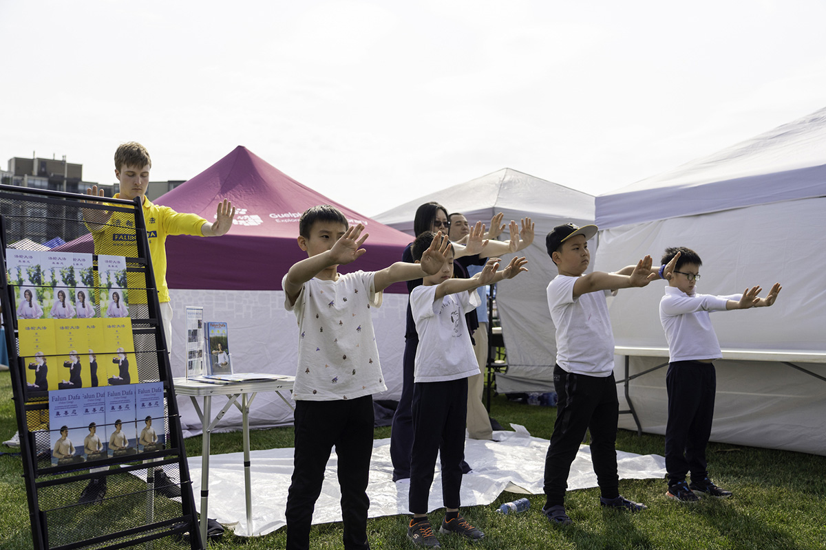 ![]() 图6:法轮大法展位上,青少年和大法小弟子们炼功 |