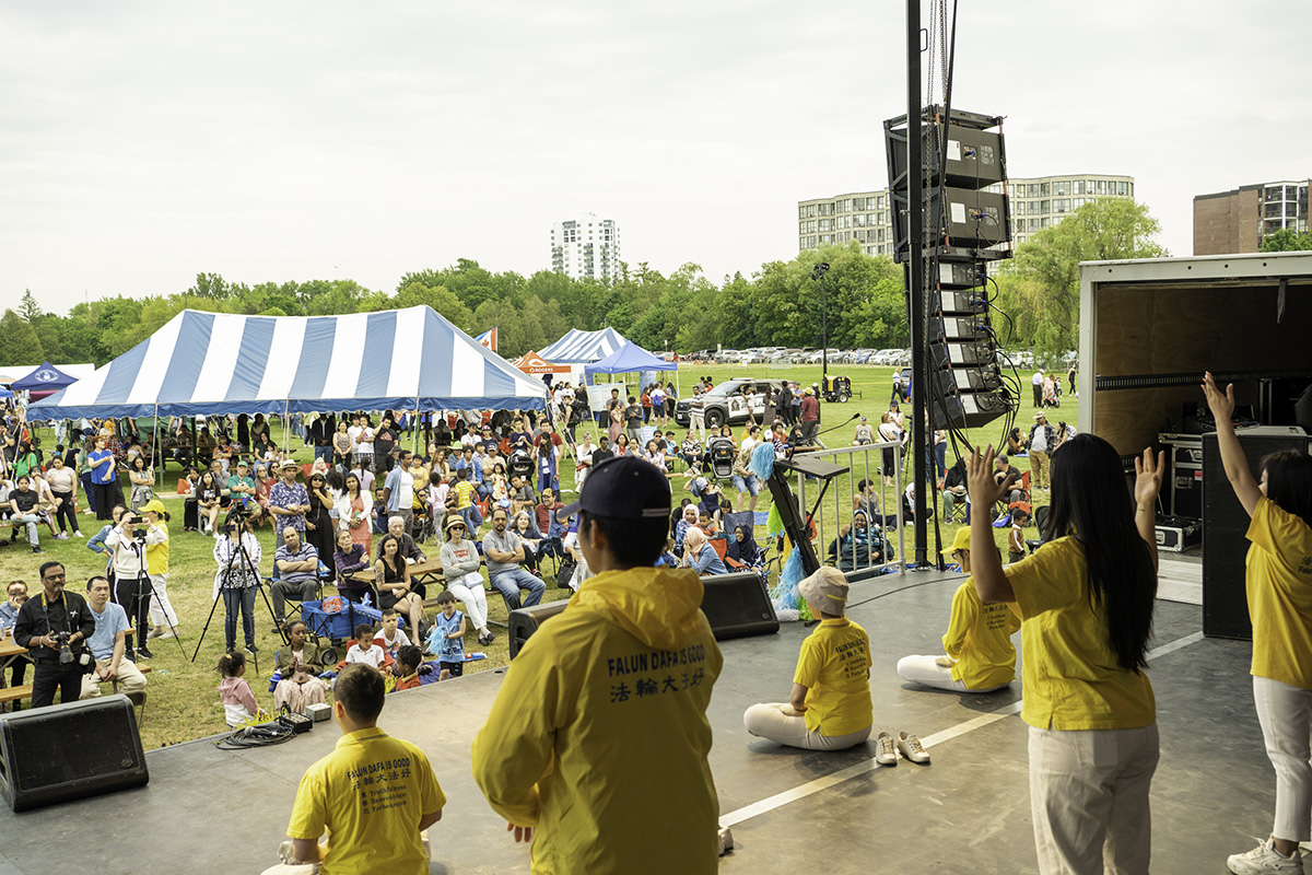 ![]() 图9~10:法轮功学员在舞台上展示五套功法,吸引了很多观众驻足观看 |