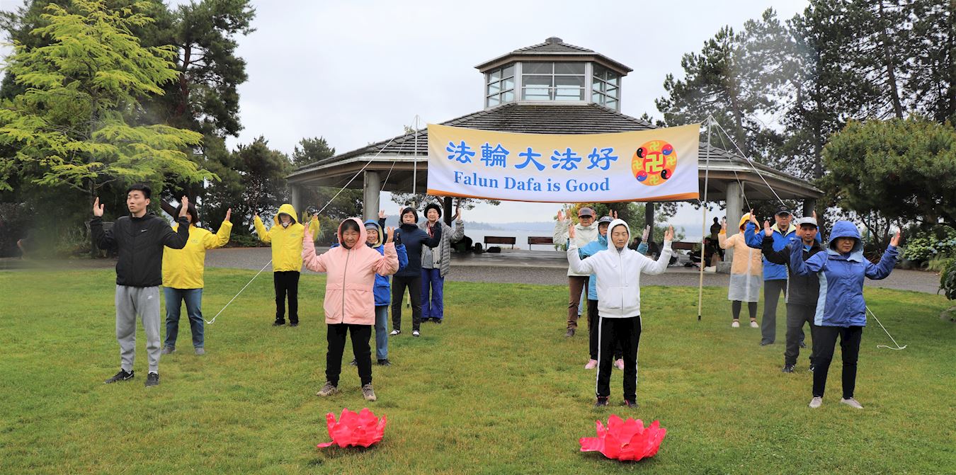 ![]() 图1:西雅图法轮功学员在滨海公园集体炼功并弘法 |