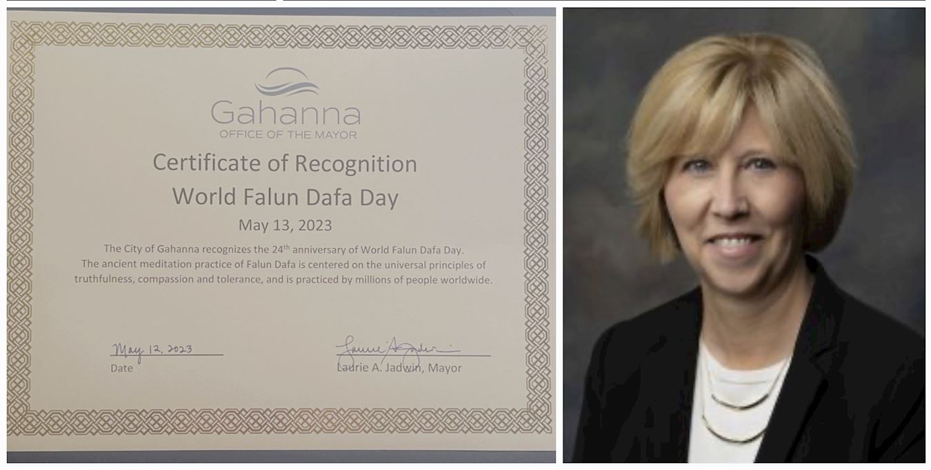 市长劳里·贾德温证书上说:汉纳市表彰第24届世界法轮大法日。法轮大法,这古老的打坐修炼方法,是以真、善、忍普世价值为核心,全世界有数百万人在修炼。