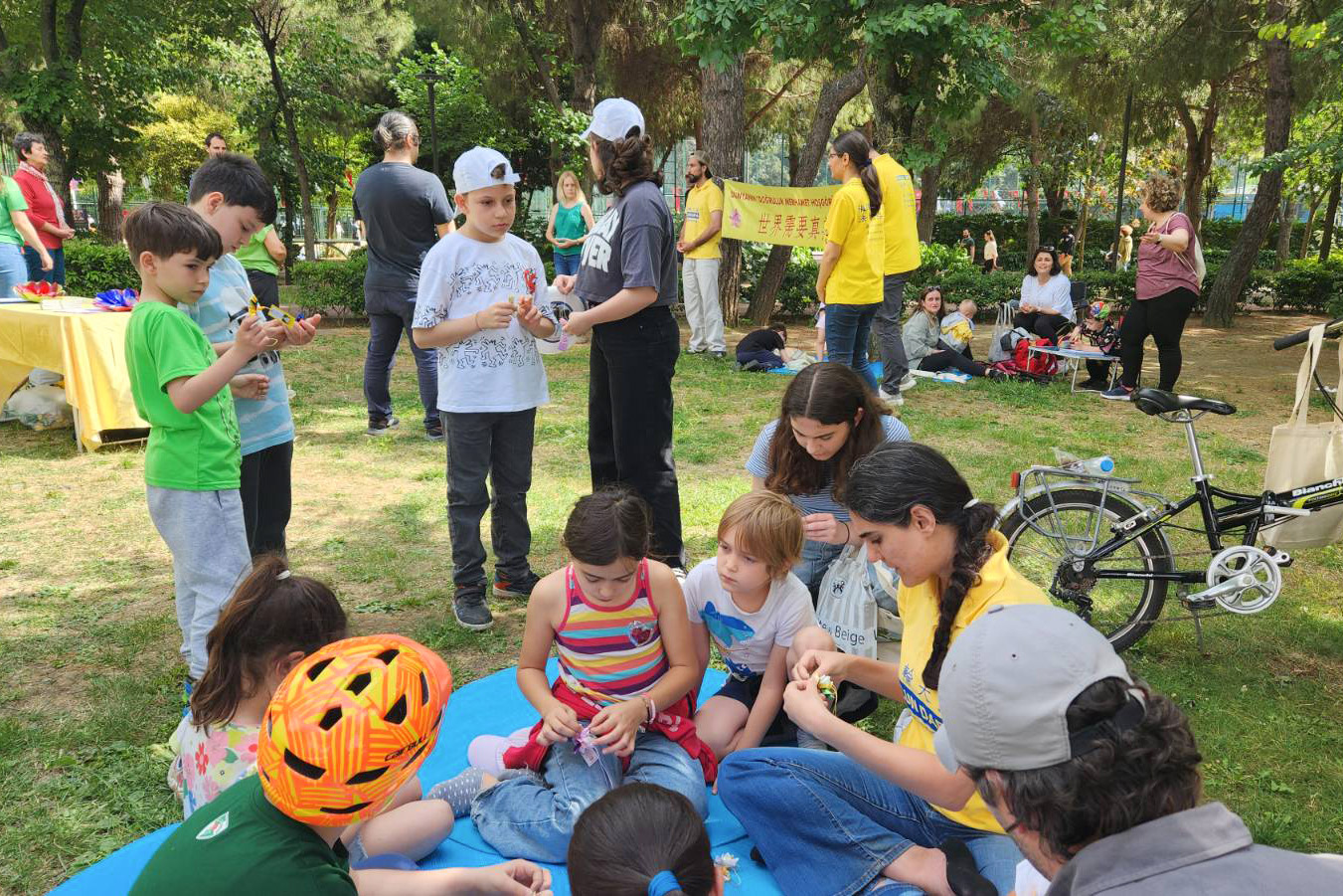 儿童们也对法轮功表现出极大的兴趣。一些儿童也跟着大人学炼法轮功功法,另一些儿童学习了如何折叠纸莲花。