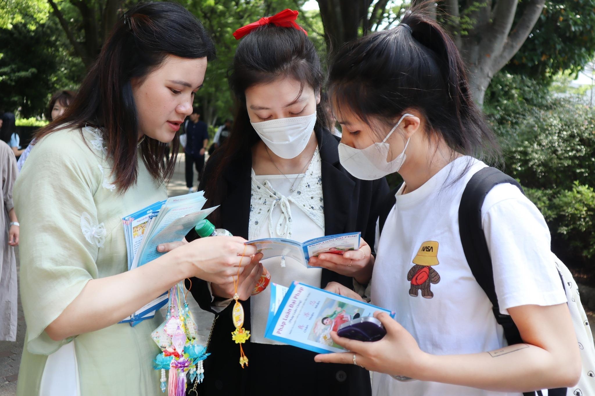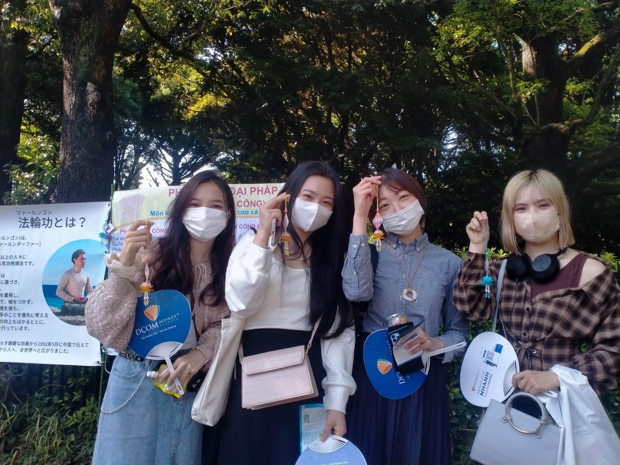 法轮功学员打出日语和越南语的法轮功简介展板,并向参加活动的人们派发了真相传单和小莲花。许多人都喜欢接小莲花,并认真的听学员们的讲述。有的表达了对活摘器官存在的惊讶,有的询问了法轮功的官网表示希望进一步了解。