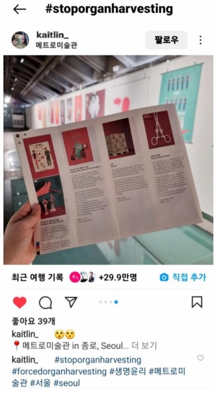 制止中共活摘器官海报作品每年都在台湾、日本、韩国等国家展出,主办方KAEOT也曾于二零二一年在韩国高丽大学、二零二二年在京畿道城南市厅举行了展示会。韩国人权团体“亚洲人类(Human Asia)”也作为赞助者参加了此次展示会。