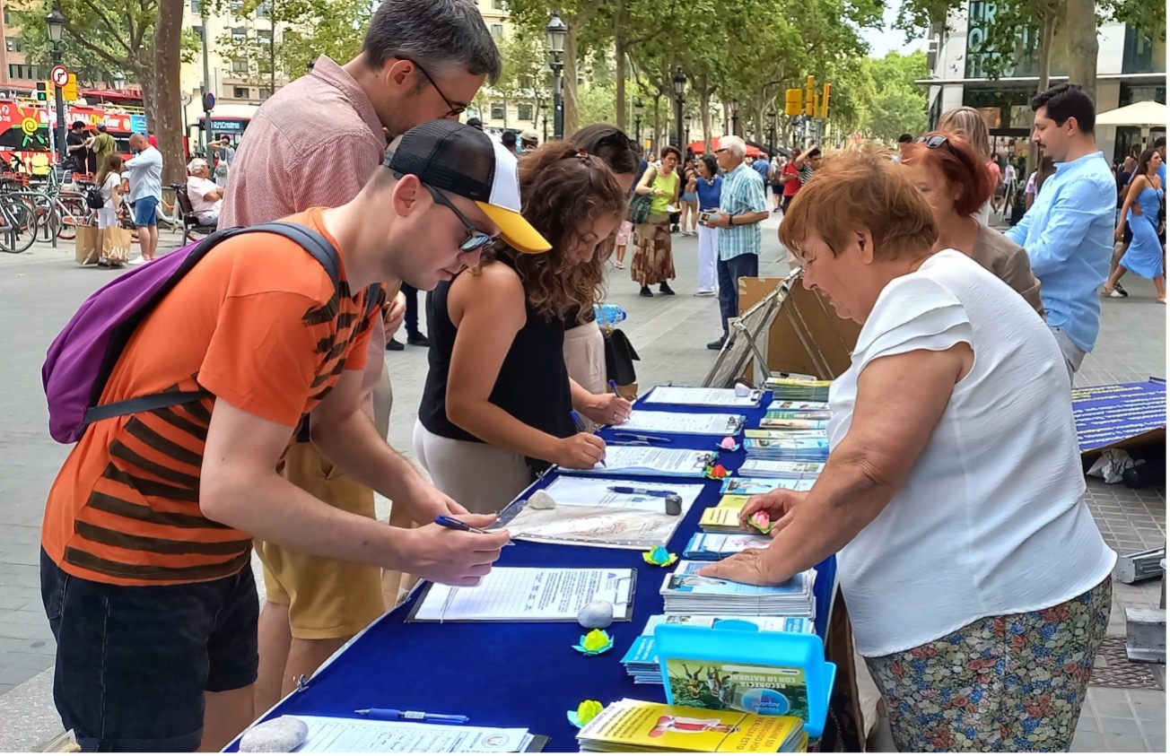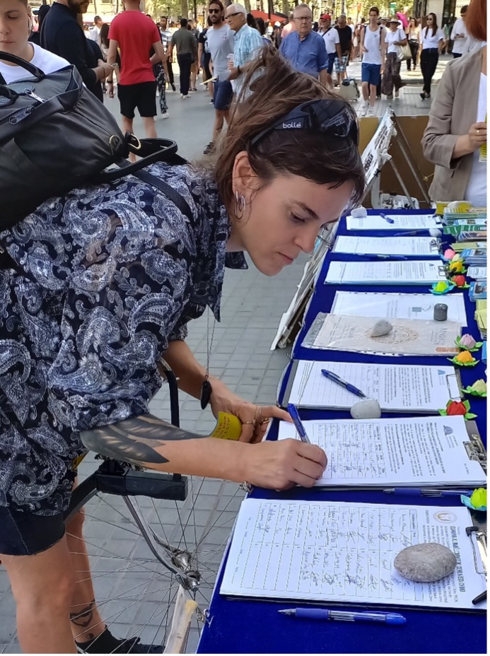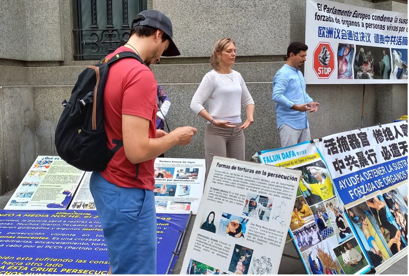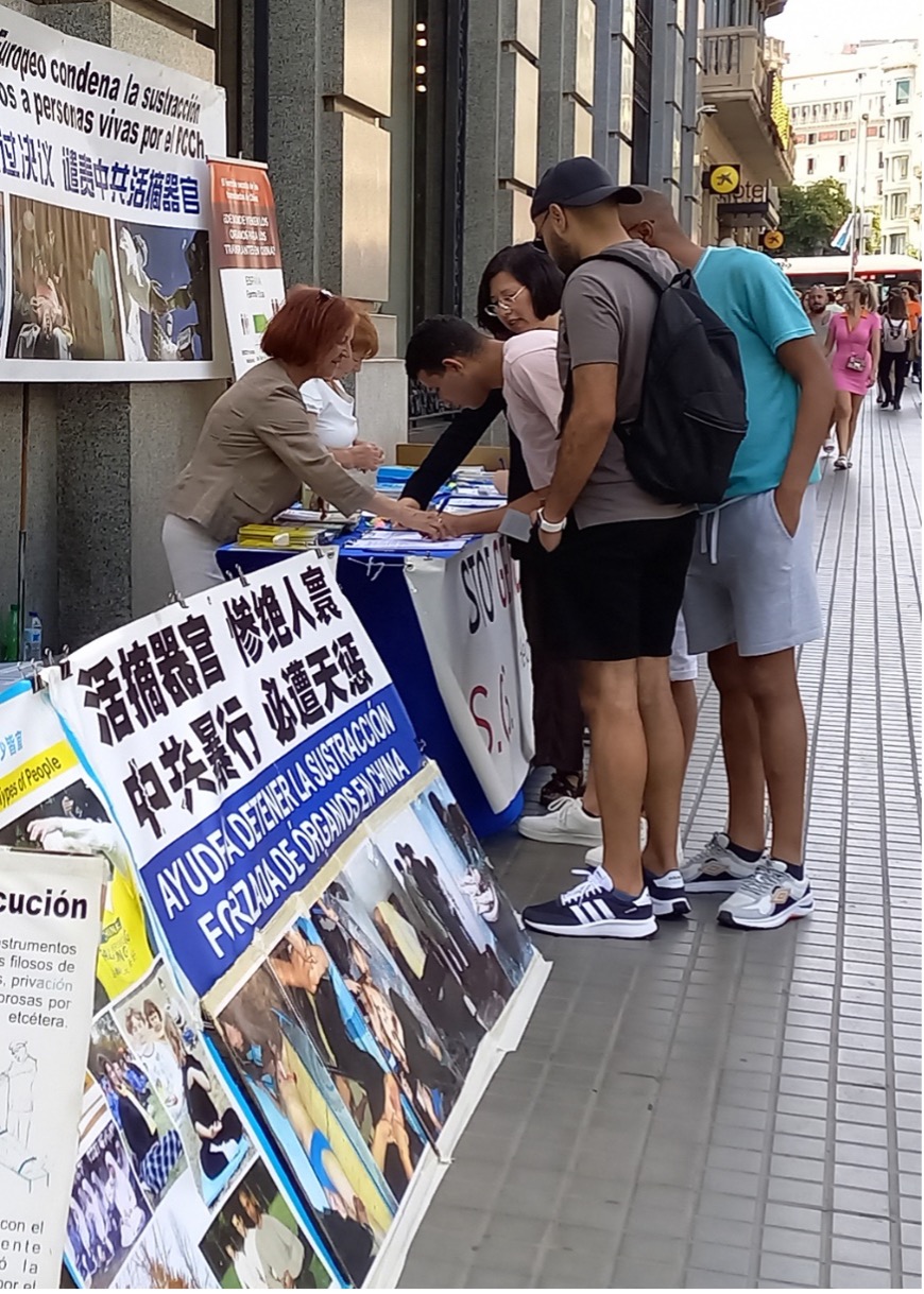 展位上摆着一份法轮大法学员向西班牙众议院发起的请愿书,要求国会谴责中共对法轮功的迫害,并调查法轮功学员在中国被任意拘押和失踪的事件——这可能是中共活摘法轮功学员器官造成的。