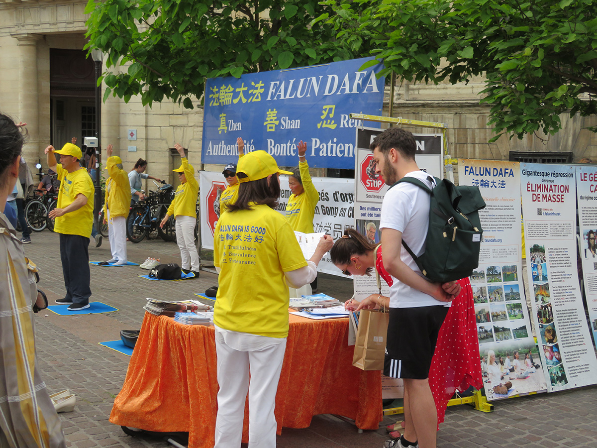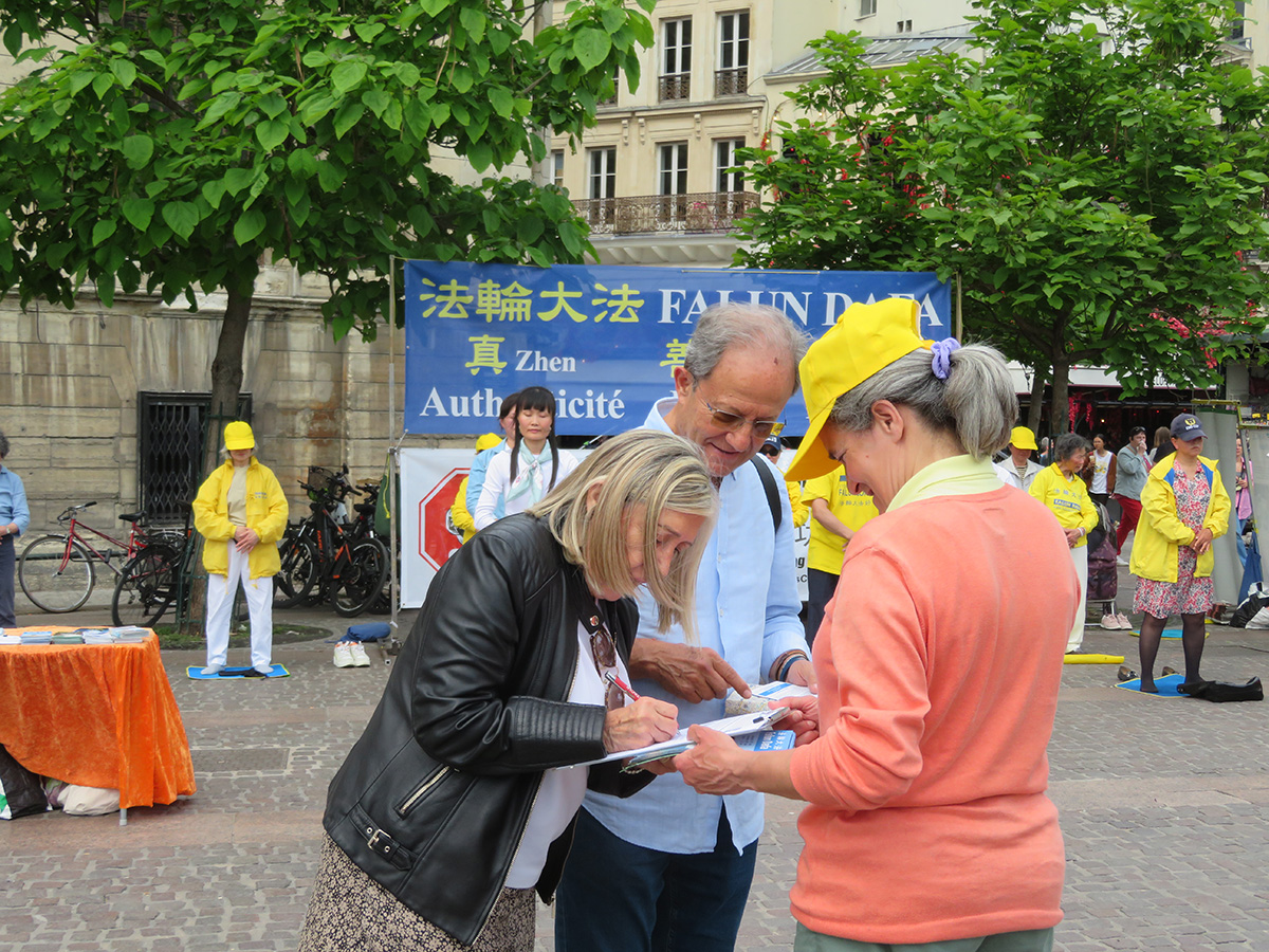 图形设计师阿梅丽·滨诺(Amélie Pinau)经过夏特雷,看到学员在演示功法,她很好奇,于是向法轮功学员询问、进行了解。她赞赏法轮功学员的勇气,鼓励学员继续下去,要让人们知道迫害真相。她跟学员说:“你们在这里做的很好,向人们介绍法轮大法,很有意义,我们很需要。”