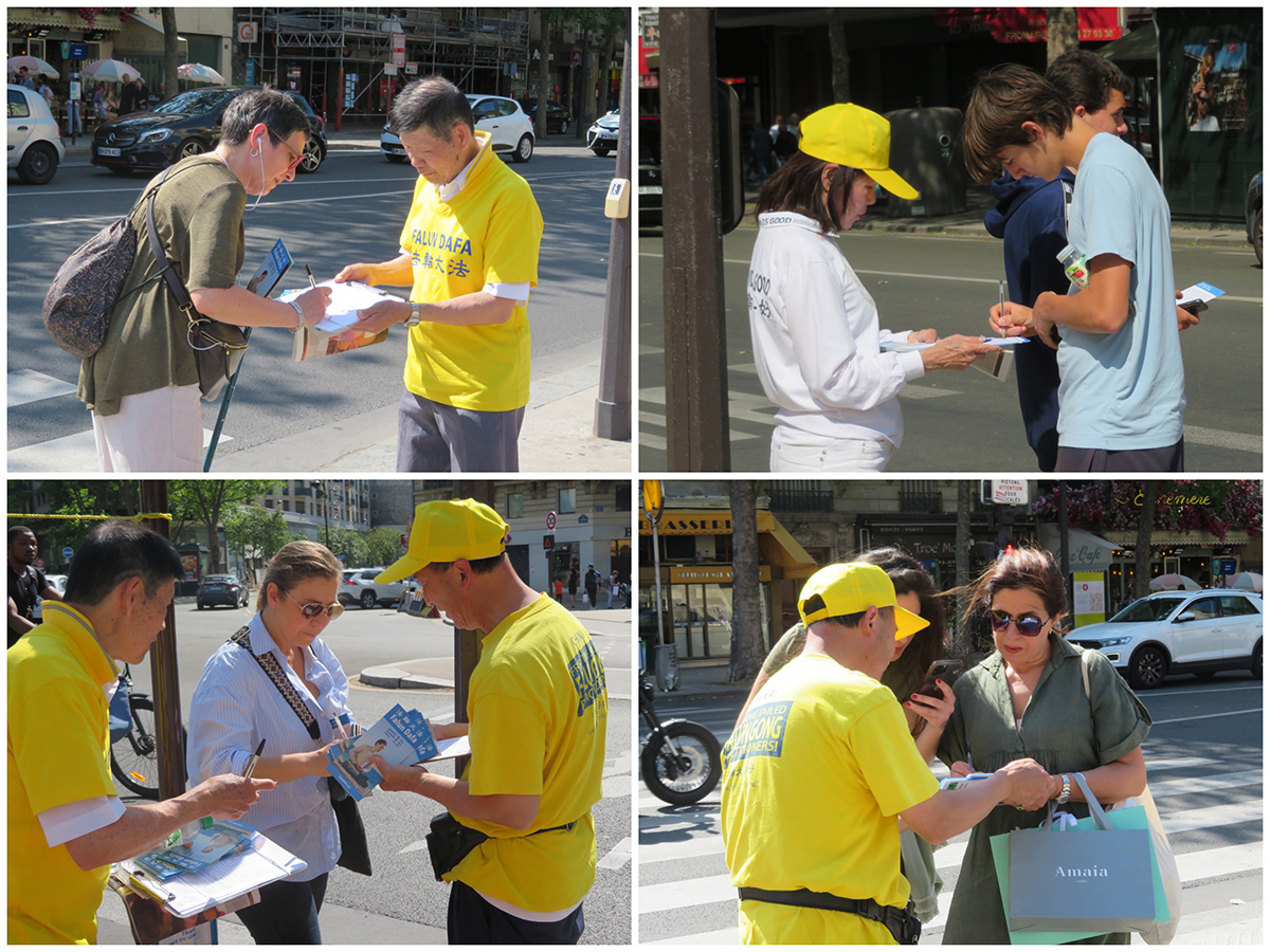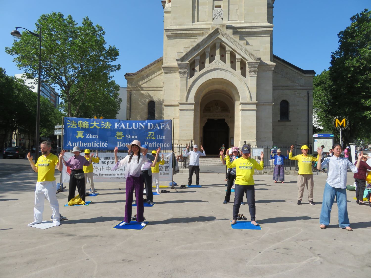 ![]() 图7:二零二三年五月二十八日下午,法轮功学员在巴黎十四区的阿莱西亚(Alésia)街区进行了炼功、讲真相和征签反迫害的活动。 |