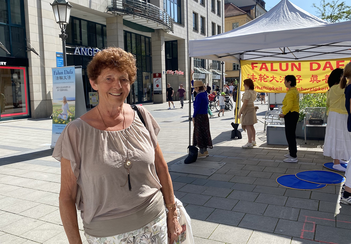 ![]() 图6:来自瑞士的心理学者迈耶女士(Margret Meyer)很高兴有机会在慕尼黑声援法轮功学员反迫害。 |