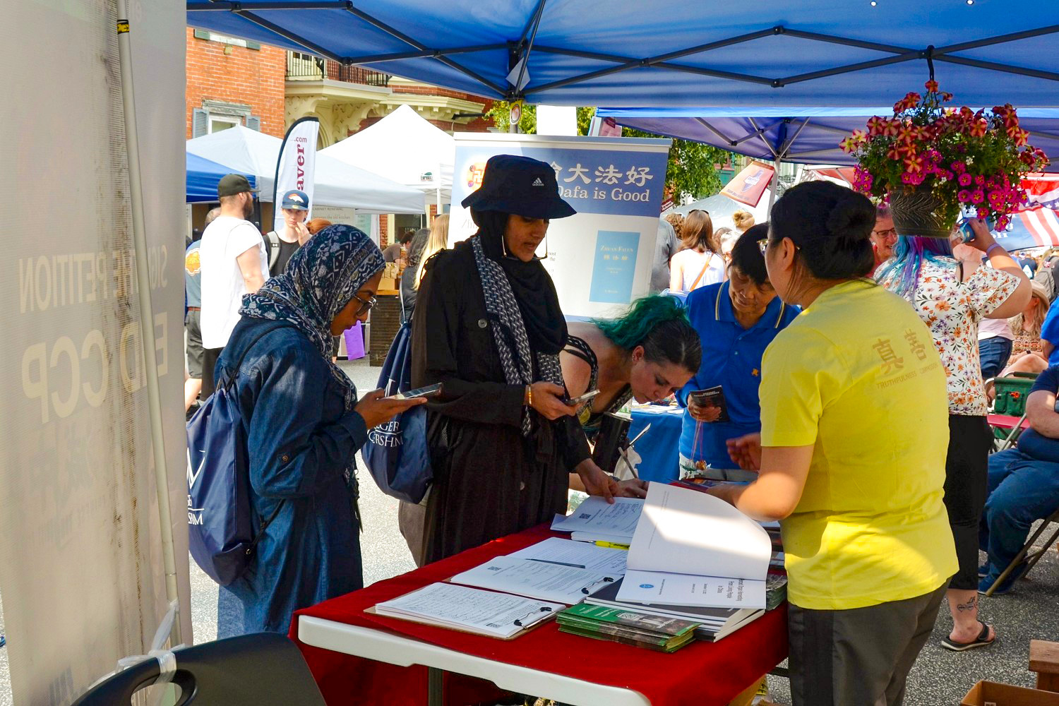 很多人看到法轮功的展位停了下来,向学员询问关于法轮功学员遭受中共迫害的情况。许多参观者了解真相后,踊跃在解体中共的请愿书上签名支持。