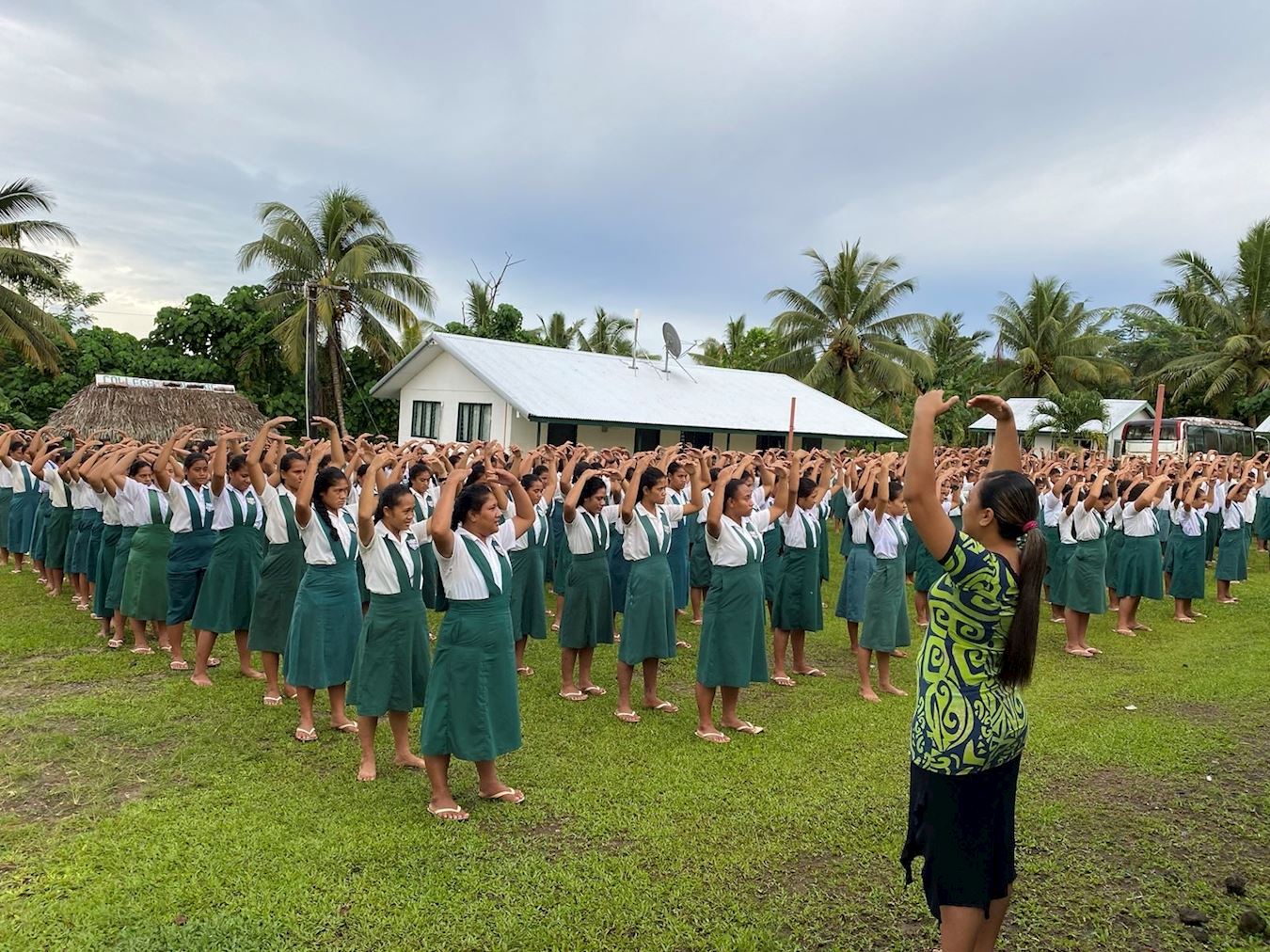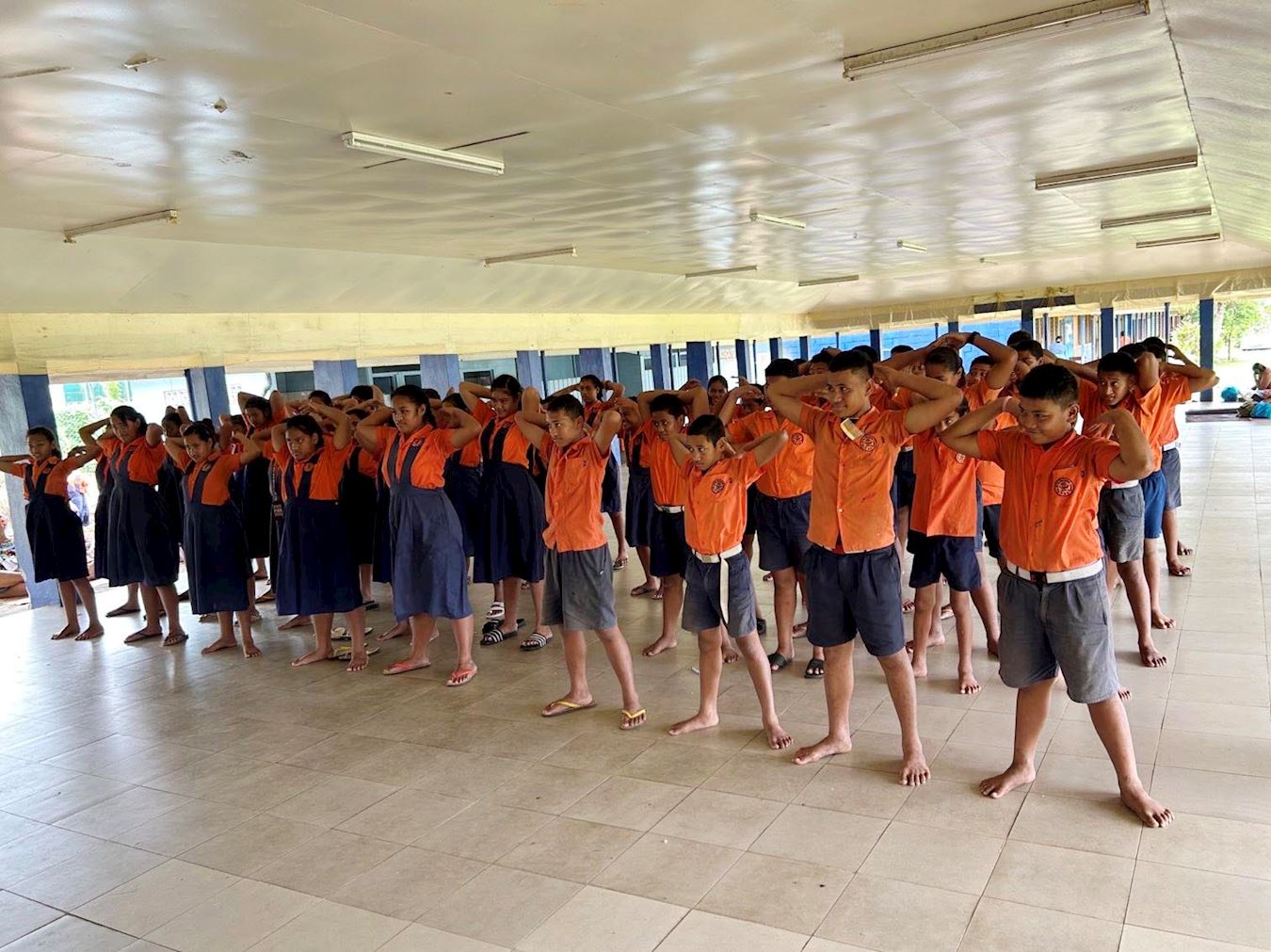 还有一个中学位于阿皮亚东区,该校有六百多学生,当天参加学功的学生有一半多,年龄在十六到十九岁之间,学校的校长亲自带着他们到大礼堂学功。为了让学生们能看清学员的动作,校长让人搬来了两张桌子,让学员站在桌子上教功。