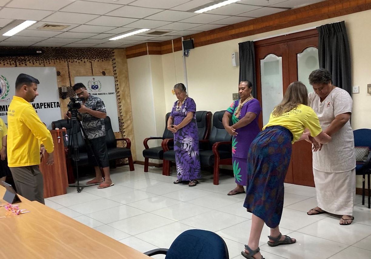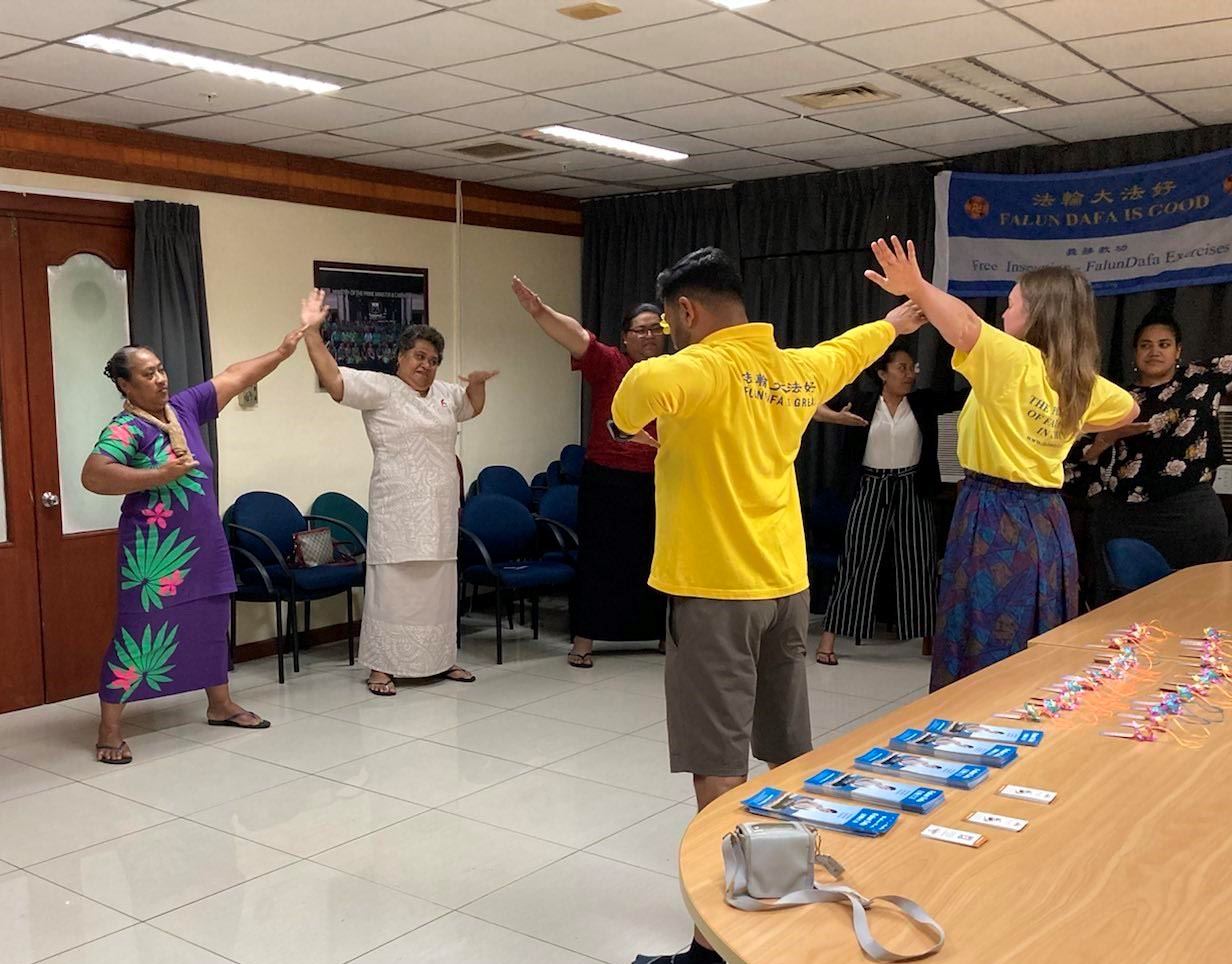六月十四日下午,新西兰法轮功学员在萨摩亚部长会议厅介绍法轮大法,并展示了五套舒展优美的功法,政府部门的七位工作人员到场学炼。