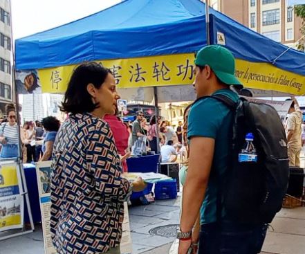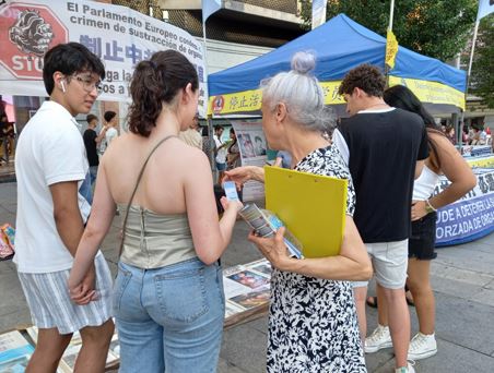 一位三十岁左右的西班牙女士,当得知中共迫害法轮功长达二十四年后,问学员可不可以再多给她一些传单。她说:“我在一家酒店工作,会经常负责组织一些活动。我会把传单发给我的同事,告诉他们在中国发生的事情。让更多的人签名支持你们的正义之举。全世界都应该对前所未有的迫害做出回应,不能让中共逍遥法外!”