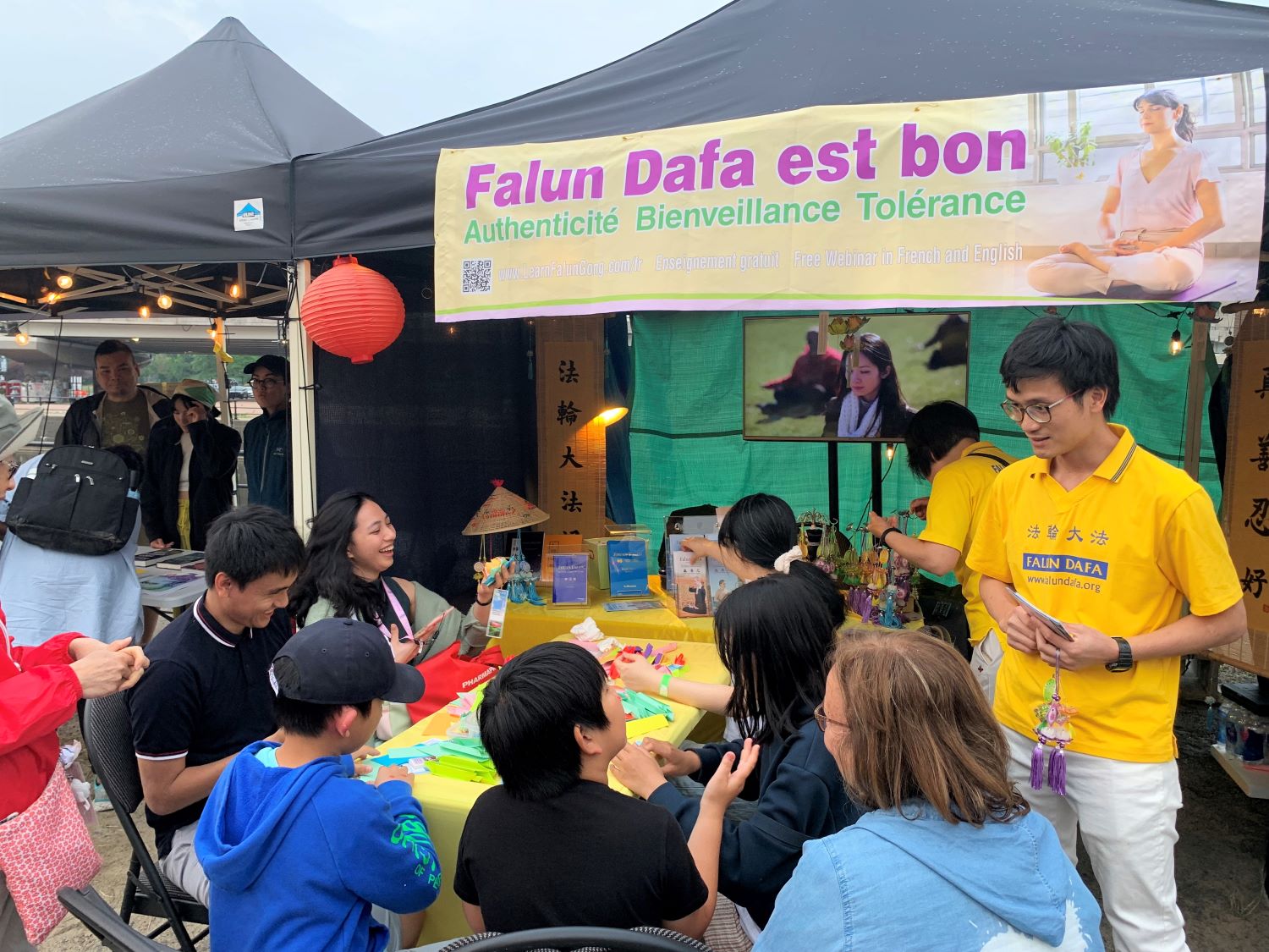 越南文化美食节在拉欣运河边举行,有二十多个摊位参展,不少家庭来这里消夏、体验东方文化。法轮功展位祥和的氛围、真善忍的信息,吸引了人们驻留,有的和法轮功学员交谈良久,有的加入折纸莲花 ,边折边了解法轮大法。