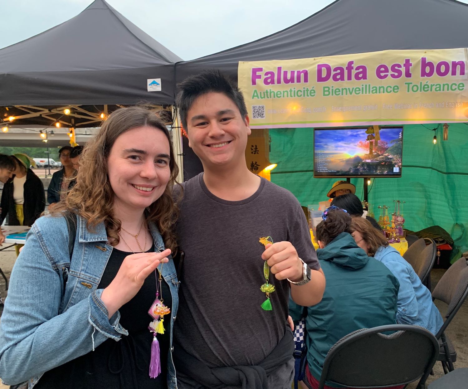大学生罗莎莉(ROSALIE)和卢卡斯(Lucas)在法轮功展位前流连忘返。罗莎莉分享道:“我大学的戏剧老师在课堂上专门介绍过法轮功,同学们都很喜欢。”每次她路过蒙特利尔唐人街,看到在那里炼功的法轮功学员,心里都很受触动。她说喜欢法轮功的准则,“真、善、忍这三个字,我觉得真好”。