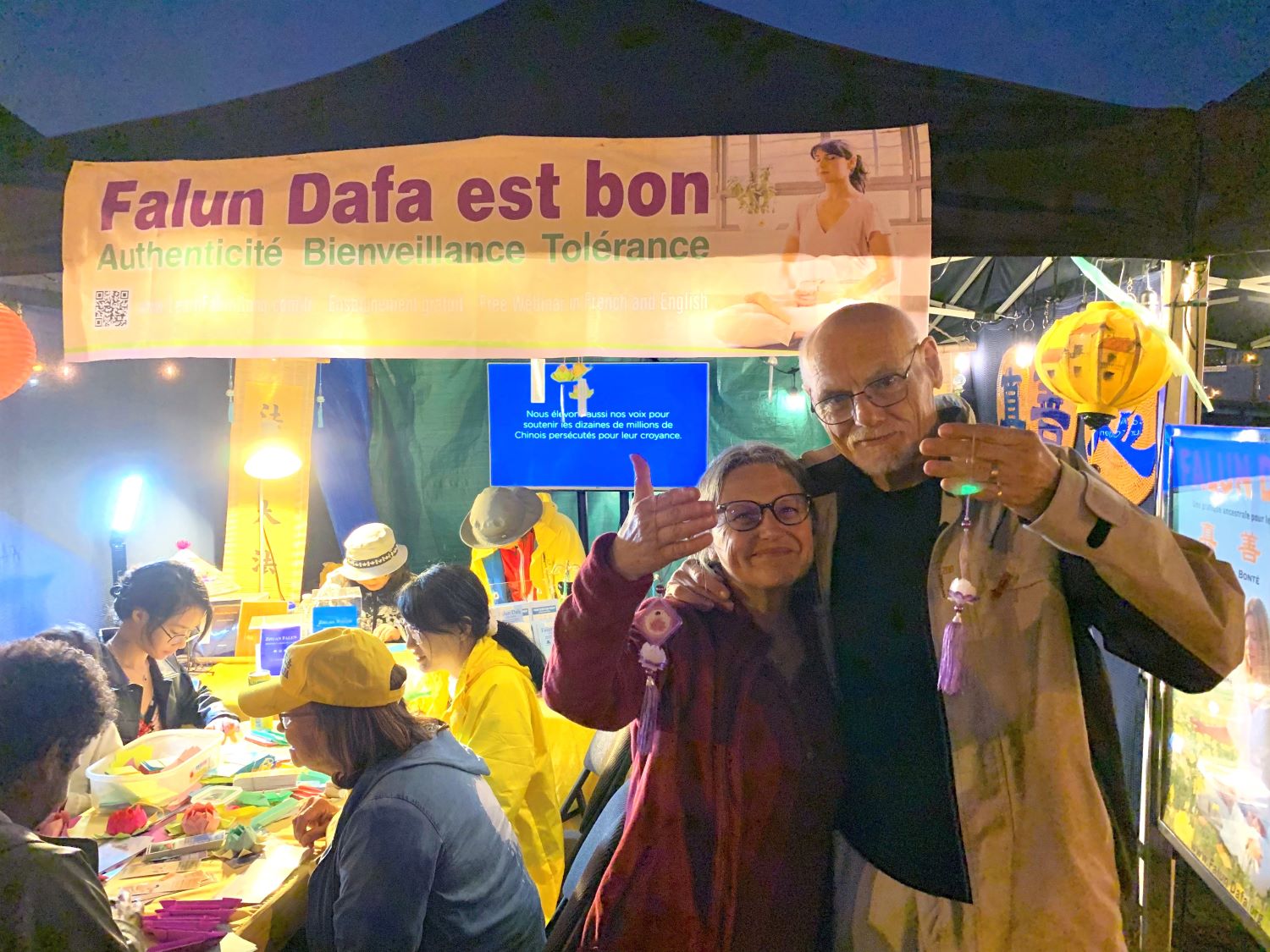 图夫奥(Truffaut)先生一家四口路过法轮功展位时被吸引住了。女儿女婿坐下来折莲花,老俩口在一旁询问法轮功功法。图夫奥先生向学员说,两人从法国巴黎来蒙特利尔看望在这里工作的女儿女婿。当听到真、善、忍三个字时,图夫奥先生高兴地说:“我太赞成了!”得知有免费的法语网上教功班,夫妇两人非常高兴地说回巴黎后会去了解。
