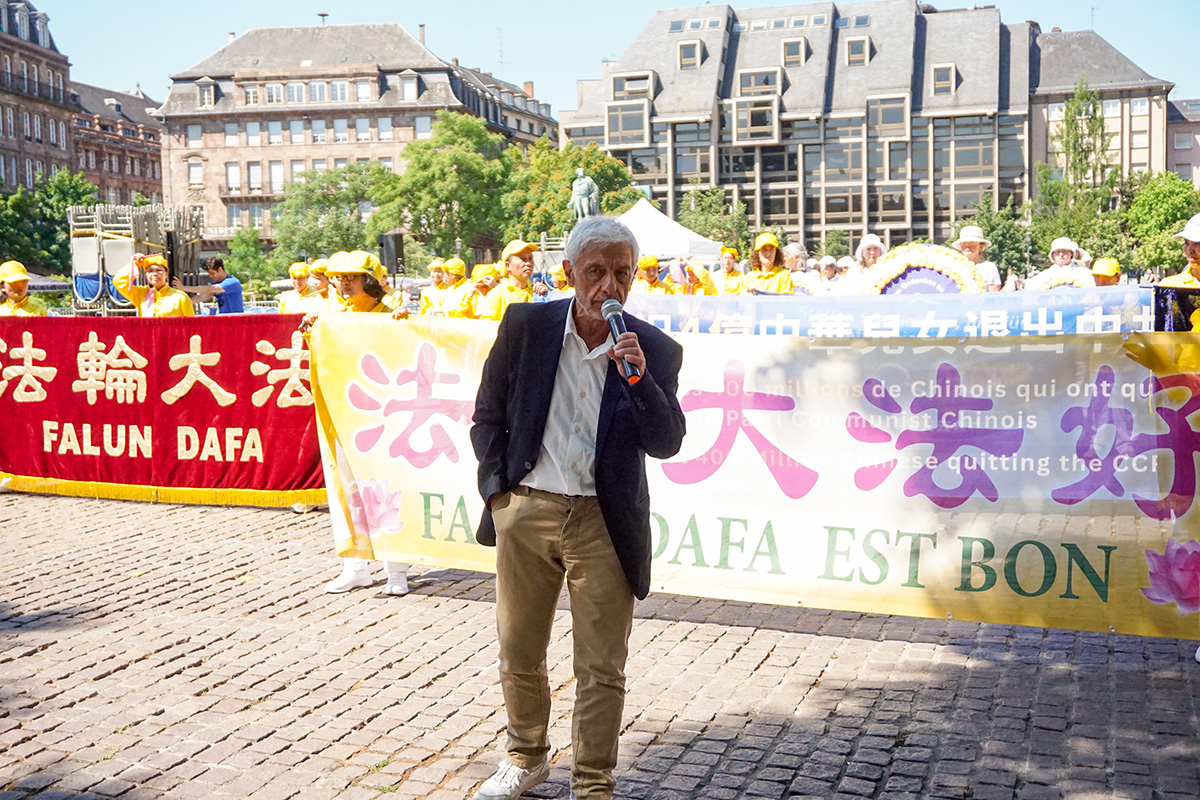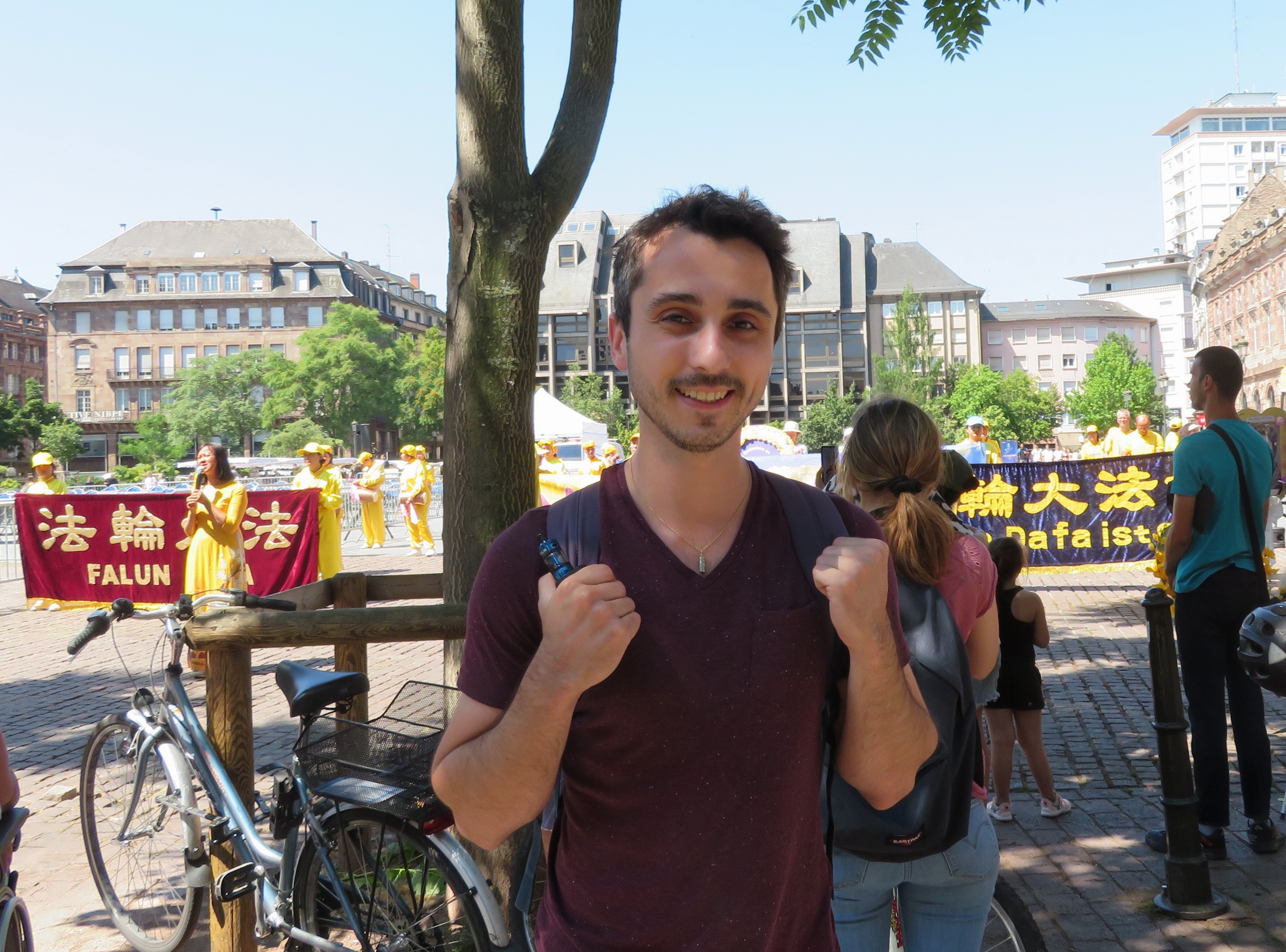 阿德里安·特里赫(Adrien Trilhé)是位法律咨询顾问,主要负责对被在押人员或判刑者提供建议和咨询。他说:“我来自贝桑松,以前从未听说过有关法轮功的真相。今天来斯特拉斯堡,碰巧知道这个信息,我很高兴。因为我关注世界上发生的大事件。我在贝桑松曾为反对有关发生在中国的迫害精神信仰和自由人士的迫害签过名。我很欣喜地知道,法轮功学员定期举行游行集会活动,进行抗争。”