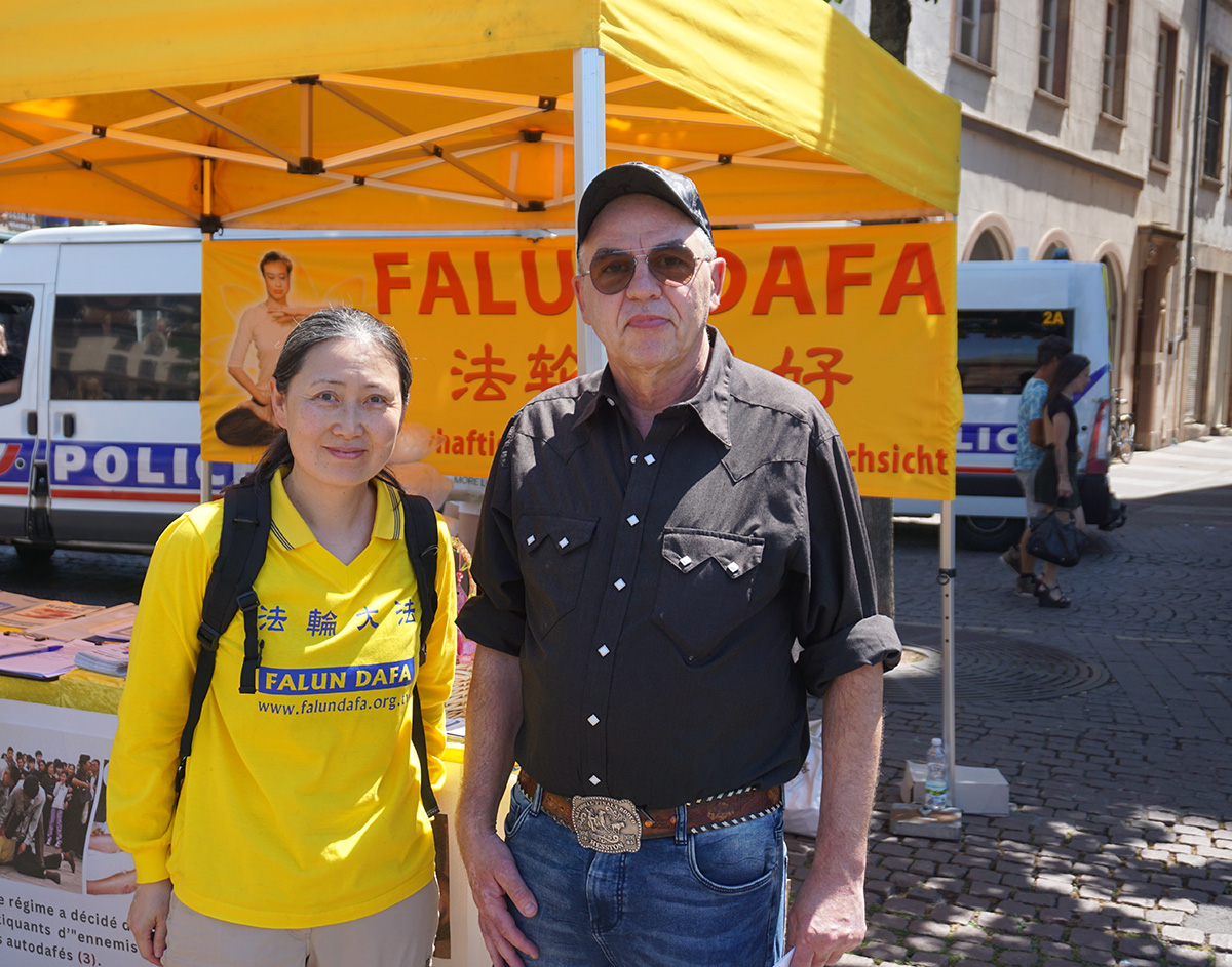 公司库存管理员皮埃尔·库斯图尔(Pierre Kustur)表示非常喜欢中国文化,曾去过三次中国。今天他的朋友告诉他在克勒贝尔(Kléber)广场有关中国文化的活动,于是他特别赶过来。这也是他第一次听到有关法轮功和在中国遭遇的迫害。